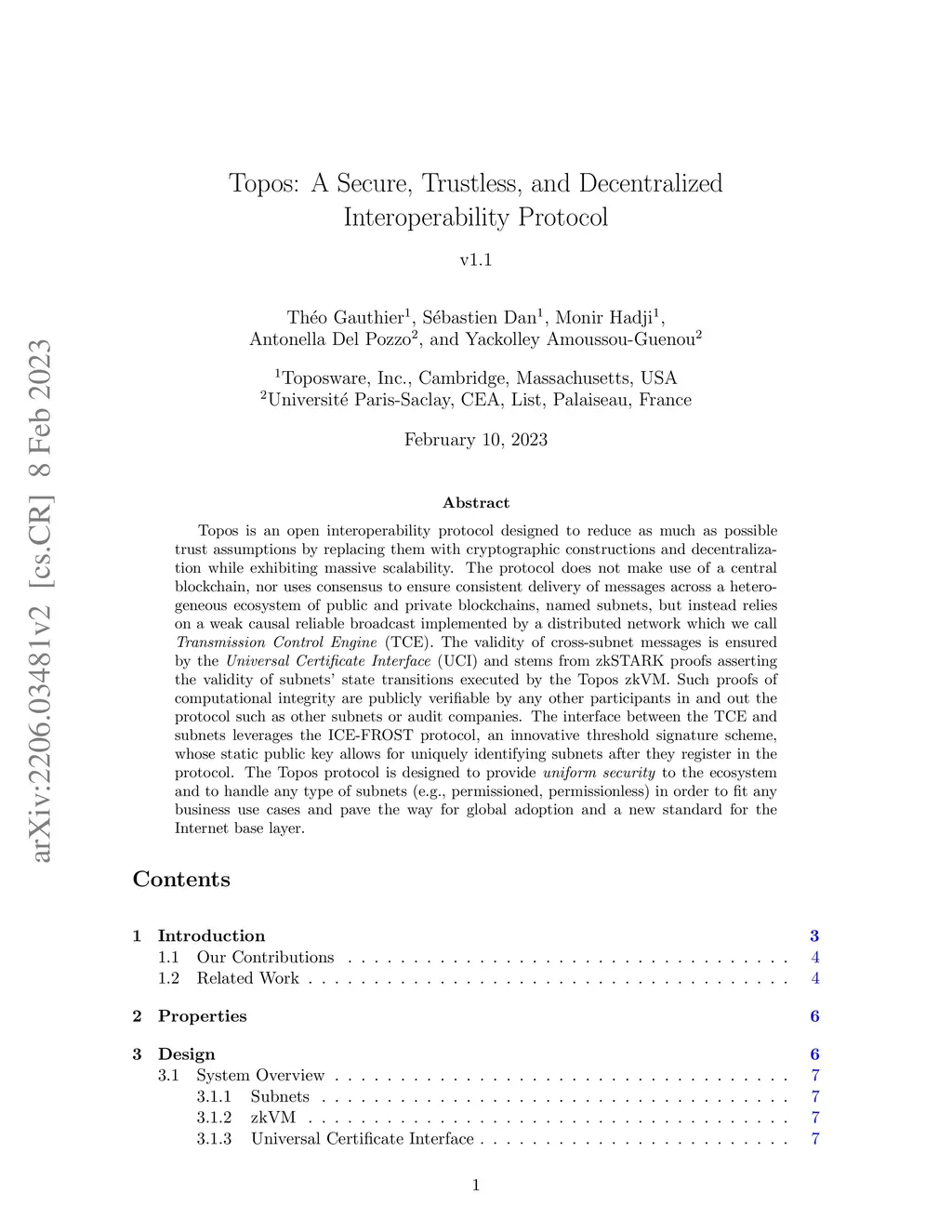 Topos is an open interoperability protocol designed to reduce as much as possible trust assumptions by replacing them with cryptographic constructions and decentralization while exhibiting massive scalability. The protocol does not make use of a central blockchain, nor uses consensus to ensure consistent delivery of messages across a heterogeneous ecosystem of public and private blockchains, named subnets, but instead relies on a weak causal reliable broadcast implemented by a distributed network which we call (TCE). The validity of cross-subnet messages is ensured by the (UCI) and stems from zkSTARK proofs asserting the validity of subnets' state transitions executed by the Topos zkVM. Such proofs of computational integrity are publicly verifiable by any other participants in and out the protocol such as other subnets or audit companies. The interface between the TCE and subnets leverages the ICE-FROST protocol, an innovative threshold signature scheme, whose static public key allows for uniquely identifying subnets after they register in the protocol. The Topos protocol is designed to provide to the ecosystem and to handle any type of subnets (e.g., permissioned, permissionless) in order to fit any business use cases and pave the way for global adoption and a new standard for the Internet base layer.