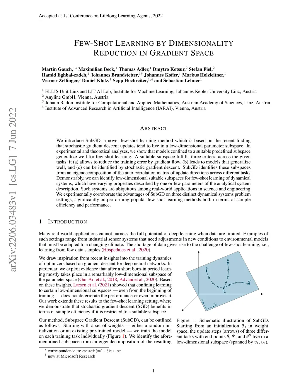We introduce SubGD, a novel few-shot learning method which is based on the recent finding that stochastic gradient descent updates tend to live in a low-dimensional parameter subspace. In experimental and theoretical analyses, we show that models confined to a suitable predefined subspace generalize well for few-shot learning. A suitable subspace fulfills three criteria across the given tasks: it (a) allows to reduce the training error by gradient flow, (b) leads to models that generalize well, and (c) can be identified by stochastic gradient descent. SubGD identifies these subspaces from an eigendecomposition of the auto-correlation matrix of update directions across different tasks. Demonstrably, we can identify low-dimensional suitable subspaces for few-shot learning of dynamical systems, which have varying properties described by one or few parameters of the analytical system description. Such systems are ubiquitous among real-world applications in science and engineering. We experimentally corroborate the advantages of SubGD on three distinct dynamical systems problem settings, significantly outperforming popular few-shot learning methods both in terms of sample efficiency and performance.