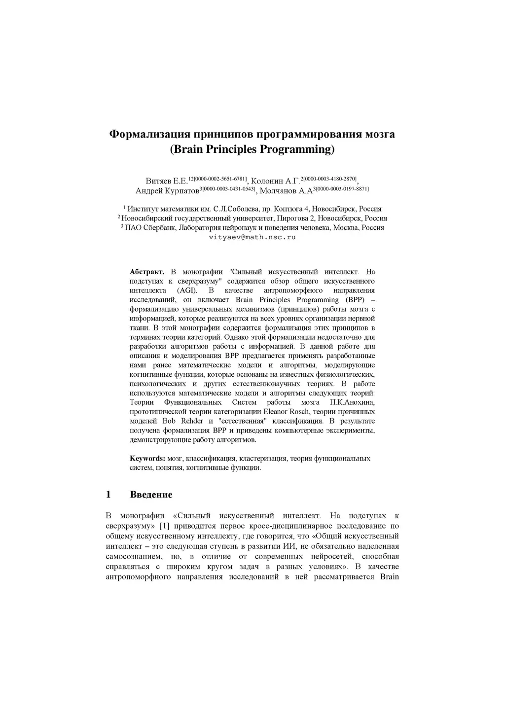 In the monograph "Strong artificial intelligence. On the Approaches to Superintelligence" contains an overview of general artificial intelligence (AGI). As an anthropomorphic research area, it includes Brain Principles Programming (BPP) -- the formalization of universal mechanisms (principles) of the brain work with information, which are implemented at all levels of the organization of nervous tissue. This monograph contains a formalization of these principles in terms of category theory. However, this formalization is not enough to develop algorithms for working with information. In this paper, for the description and modeling of BPP, it is proposed to apply mathematical models and algorithms developed earlier, which modeling cognitive functions and base on well-known physiological, psychological and other natural science theories. The paper uses mathematical models and algorithms of the following theories: P.K.Anokhin Theory of Functional Brain Systems, Eleanor Rosch prototypical categorization theory, Bob Rehder theory of causal models and "natural" classification. As a result, a formalization of BPP is obtained and computer experiments demonstrating the operation of algorithms are presented.