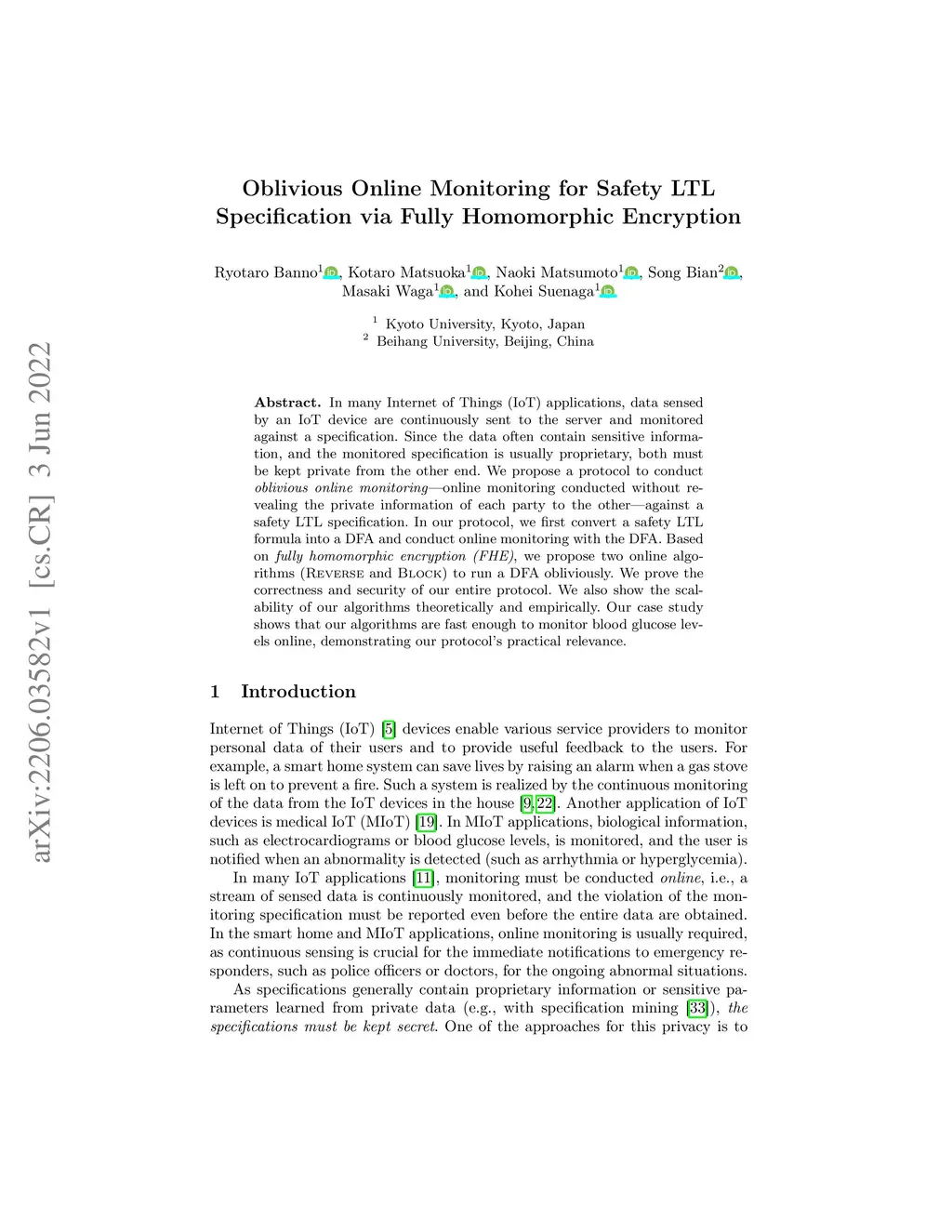 In many Internet of Things (IoT) applications, data sensed by an IoT device are continuously sent to the server and monitored against a specification. Since the data often contain sensitive information, and the monitored specification is usually proprietary, both must be kept private from the other end. We propose a protocol to conduct oblivious online monitoring -- online monitoring conducted without revealing the private information of each party to the other -- against a safety LTL specification. In our protocol, we first convert a safety LTL formula into a DFA and conduct online monitoring with the DFA. Based on fully homomorphic encryption (FHE), we propose two online algorithms (Reverse and Block) to run a DFA obliviously. We prove the correctness and security of our entire protocol. We also show the scalability of our algorithms theoretically and empirically. Our case study shows that our algorithms are fast enough to monitor blood glucose levels online, demonstrating our protocol's practical relevance.