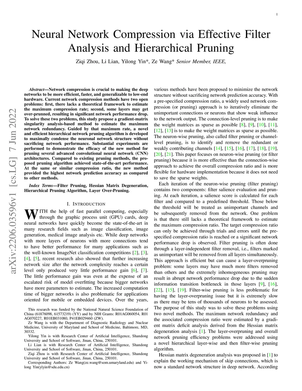 Network compression is crucial to making the deep networks to be more efficient, faster, and generalizable to low-end hardware. Current network compression methods have two open problems: first, there lacks a theoretical framework to estimate the maximum compression rate; second, some layers may get over-prunned, resulting in significant network performance drop. To solve these two problems, this study propose a gradient-matrix singularity analysis-based method to estimate the maximum network redundancy. Guided by that maximum rate, a novel and efficient hierarchical network pruning algorithm is developed to maximally condense the neuronal network structure without sacrificing network performance. Substantial experiments are performed to demonstrate the efficacy of the new method for pruning several advanced convolutional neural network (CNN) architectures. Compared to existing pruning methods, the proposed pruning algorithm achieved state-of-the-art performance. At the same or similar compression ratio, the new method provided the highest network prediction accuracy as compared to other methods.