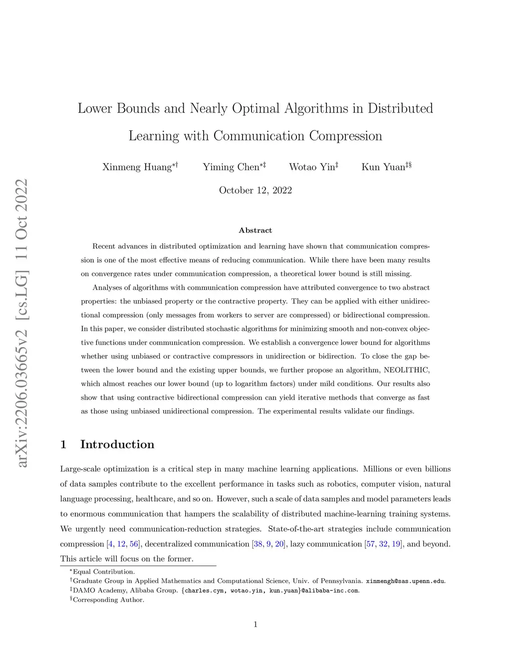 Recent advances in distributed optimization and learning have shown that communication compression is one of the most effective means of reducing communication. While there have been many results on convergence rates under communication compression, a theoretical lower bound is still missing. Analyses of algorithms with communication compression have attributed convergence to two abstract properties: the unbiased property or the contractive property. They can be applied with either unidirectional compression (only messages from workers to server are compressed) or bidirectional compression. In this paper, we consider distributed stochastic algorithms for minimizing smooth and non-convex objective functions under communication compression. We establish a convergence lower bound for algorithms whether using unbiased or contractive compressors in unidirection or bidirection. To close the gap between the lower bound and the existing upper bounds, we further propose an algorithm, NEOLITHIC, which almost reaches our lower bound (up to logarithm factors) under mild conditions. Our results also show that using contractive bidirectional compression can yield iterative methods that converge as fast as those using unbiased unidirectional compression. The experimental results validate our findings.