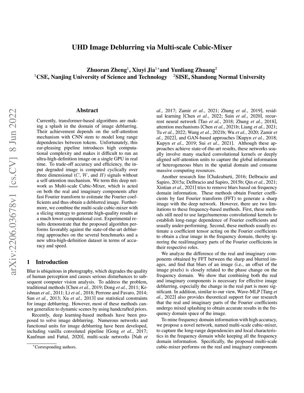 Currently, transformer-based algorithms are making a splash in the domain of image deblurring. Their achievement depends on the self-attention mechanism with CNN stem to model long range dependencies between tokens. Unfortunately, this ear-pleasing pipeline introduces high computational complexity and makes it difficult to run an ultra-high-definition image on a single GPU in real time. To trade-off accuracy and efficiency, the input degraded image is computed cyclically over three dimensional (, , and ) signals without a self-attention mechanism. We term this deep network as Multi-scale Cubic-Mixer, which is acted on both the real and imaginary components after fast Fourier transform to estimate the Fourier coefficients and thus obtain a deblurred image. Furthermore, we combine the multi-scale cubic-mixer with a slicing strategy to generate high-quality results at a much lower computational cost. Experimental results demonstrate that the proposed algorithm performs favorably against the state-of-the-art deblurring approaches on the several benchmarks and a new ultra-high-definition dataset in terms of accuracy and speed.