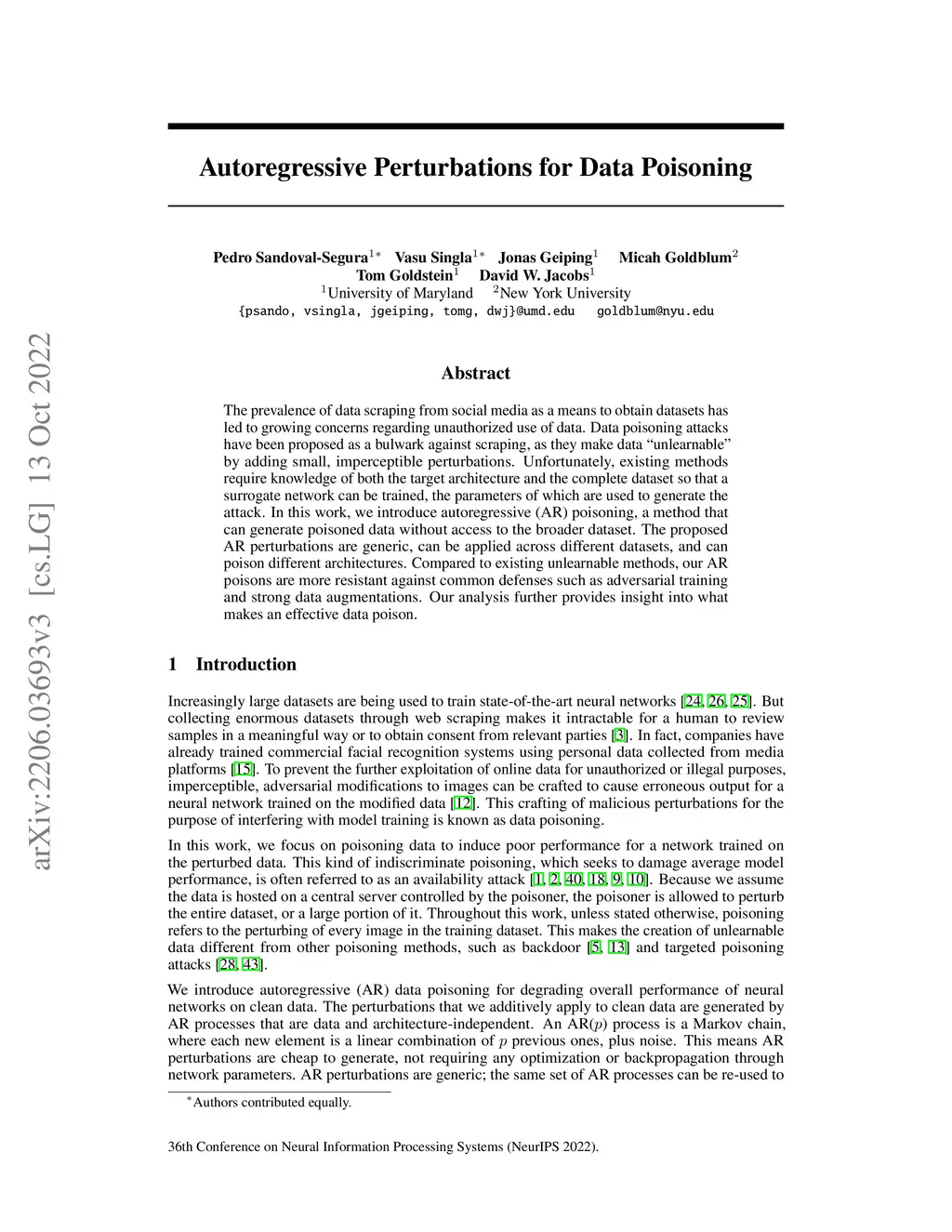 The prevalence of data scraping from social media as a means to obtain datasets has led to growing concerns regarding unauthorized use of data. Data poisoning attacks have been proposed as a bulwark against scraping, as they make data "unlearnable" by adding small, imperceptible perturbations. Unfortunately, existing methods require knowledge of both the target architecture and the complete dataset so that a surrogate network can be trained, the parameters of which are used to generate the attack. In this work, we introduce autoregressive (AR) poisoning, a method that can generate poisoned data without access to the broader dataset. The proposed AR perturbations are generic, can be applied across different datasets, and can poison different architectures. Compared to existing unlearnable methods, our AR poisons are more resistant against common defenses such as adversarial training and strong data augmentations. Our analysis further provides insight into what makes an effective data poison.