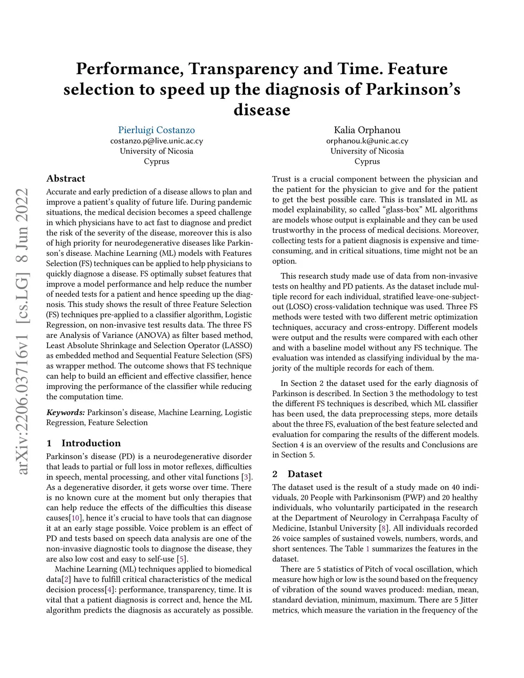 Accurate and early prediction of a disease allows to plan and improve a patient's quality of future life. During pandemic situations, the medical decision becomes a speed challenge in which physicians have to act fast to diagnose and predict the risk of the severity of the disease, moreover this is also of high priority for neurodegenerative diseases like Parkinson's disease. Machine Learning (ML) models with Features Selection (FS) techniques can be applied to help physicians to quickly diagnose a disease. FS optimally subset features that improve a model performance and help reduce the number of needed tests for a patient and hence speeding up the diagnosis. This study shows the result of three Feature Selection (FS) techniques pre-applied to a classifier algorithm, Logistic Regression, on non-invasive test results data. The three FS are Analysis of Variance (ANOVA) as filter based method, Least Absolute Shrinkage and Selection Operator (LASSO) as embedded method and Sequential Feature Selection (SFS) as wrapper method. The outcome shows that FS technique can help to build an efficient and effective classifier, hence improving the performance of the classifier while reducing the computation time.