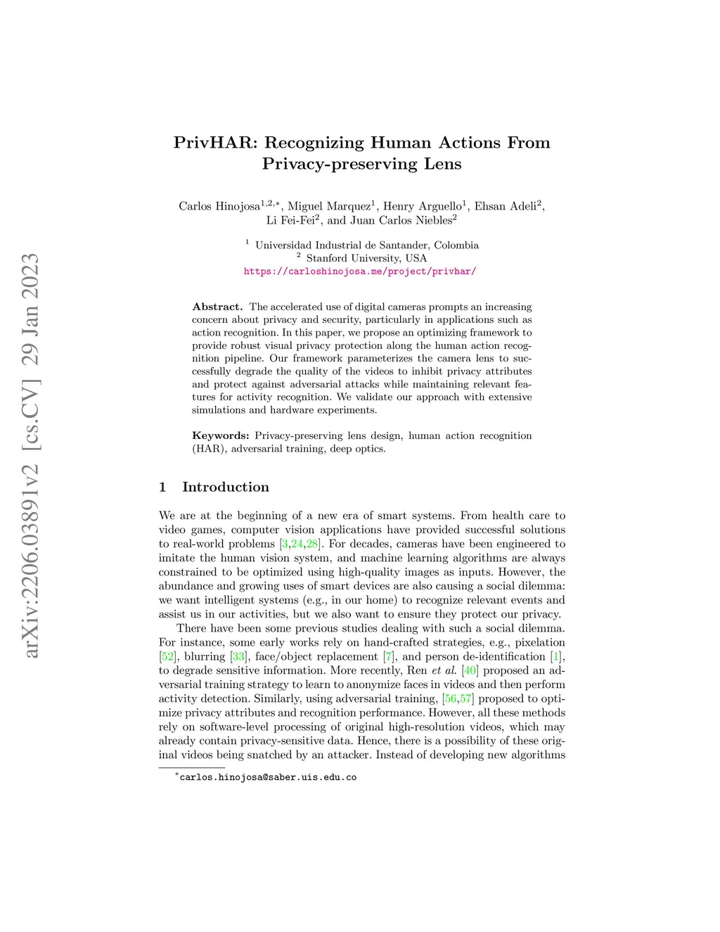 The accelerated use of digital cameras prompts an increasing concern about privacy and security, particularly in applications such as action recognition. In this paper, we propose an optimizing framework to provide robust visual privacy protection along the human action recognition pipeline. Our framework parameterizes the camera lens to successfully degrade the quality of the videos to inhibit privacy attributes and protect against adversarial attacks while maintaining relevant features for activity recognition. We validate our approach with extensive simulations and hardware experiments.