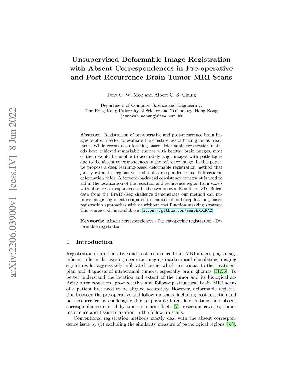 Registration of pre-operative and post-recurrence brain images is often needed to evaluate the effectiveness of brain gliomas treatment. While recent deep learning-based deformable registration methods have achieved remarkable success with healthy brain images, most of them would be unable to accurately align images with pathologies due to the absent correspondences in the reference image. In this paper, we propose a deep learning-based deformable registration method that jointly estimates regions with absent correspondence and bidirectional deformation fields. A forward-backward consistency constraint is used to aid in the localization of the resection and recurrence region from voxels with absence correspondences in the two images. Results on 3D clinical data from the BraTS-Reg challenge demonstrate our method can improve image alignment compared to traditional and deep learning-based registration approaches with or without cost function masking strategy. The source code is available at https://github.com/cwmok/DIRAC.