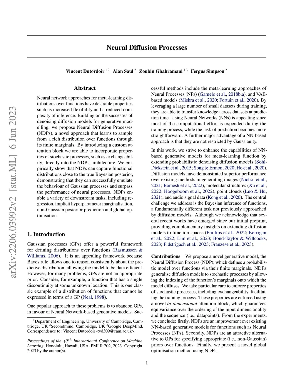 Neural network approaches for meta-learning distributions over functions have desirable properties such as increased flexibility and a reduced complexity of inference. Building on the successes of denoising diffusion models for generative modelling, we propose Neural Diffusion Processes (NDPs), a novel approach that learns to sample from a rich distribution over functions through its finite marginals. By introducing a custom attention block we are able to incorporate properties of stochastic processes, such as exchangeability, directly into the NDP's architecture. We empirically show that NDPs can capture functional distributions close to the true Bayesian posterior, demonstrating that they can successfully emulate the behaviour of Gaussian processes and surpass the performance of neural processes. NDPs enable a variety of downstream tasks, including regression, implicit hyperparameter marginalisation, non-Gaussian posterior prediction and global optimisation.