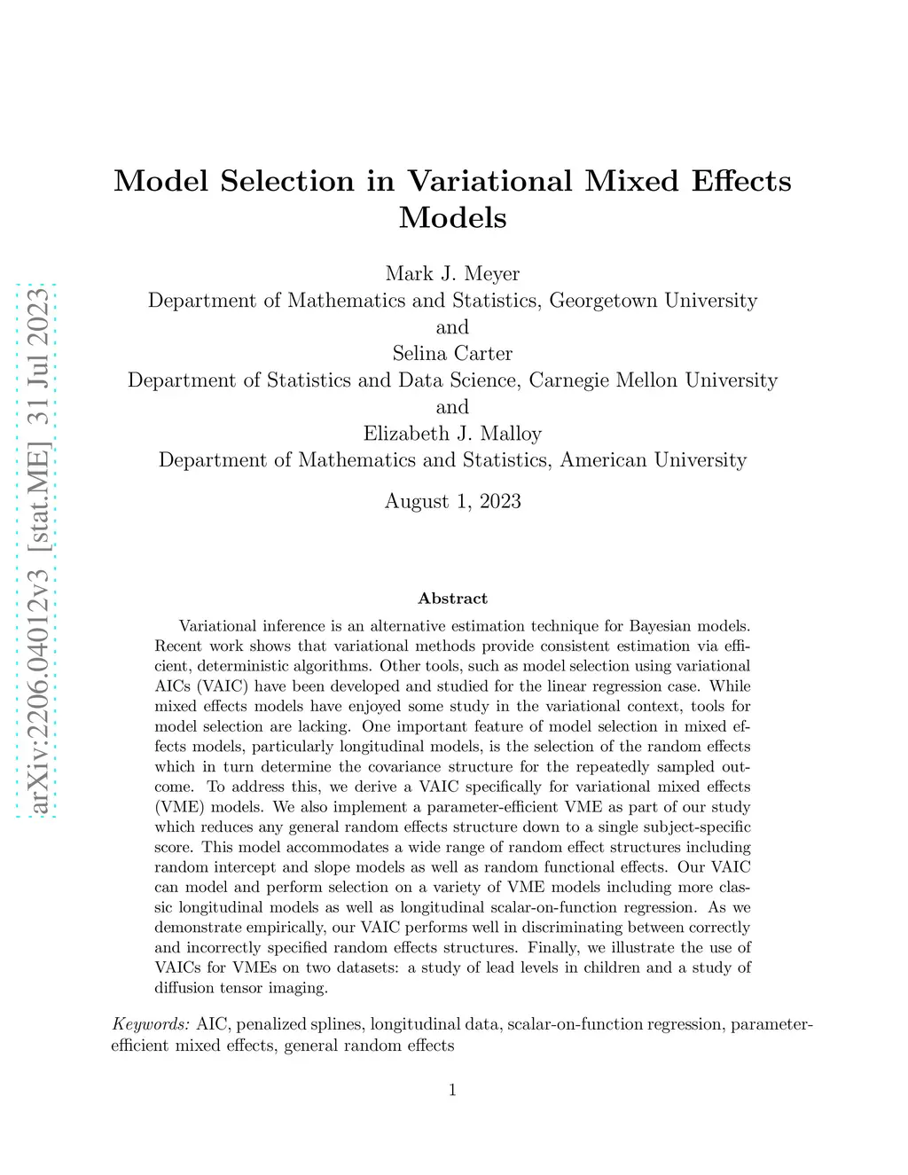 Variational inference is an alternative estimation technique for Bayesian models. Recent work shows that variational methods provide consistent estimation via efficient, deterministic algorithms. Other tools, such as model selection using variational AICs (VAIC) have been developed and studied for the linear regression case. While mixed effects models have enjoyed some study in the variational context, tools for model selection are lacking. One important feature of model selection in mixed effects models, particularly longitudinal models, is the selection of the random effects which in turn determine the covariance structure for the repeatedly sampled outcome. To address this, we derive a VAIC specifically for variational mixed effects (VME) models. We also implement a parameter-efficient VME as part of our study which reduces any general random effects structure down to a single subject-specific score. This model accommodates a wide range of random effect structures including random intercept and slope models as well as random functional effects. Our VAIC can model and perform selection on a variety of VME models including more classic longitudinal models as well as longitudinal scalar-on-function regression. As we demonstrate empirically, our VAIC performs well in discriminating between correctly and incorrectly specified random effects structures. Finally, we illustrate the use of VAICs for VMEs on two datasets: a study of lead levels in children and a study of diffusion tensor imaging.