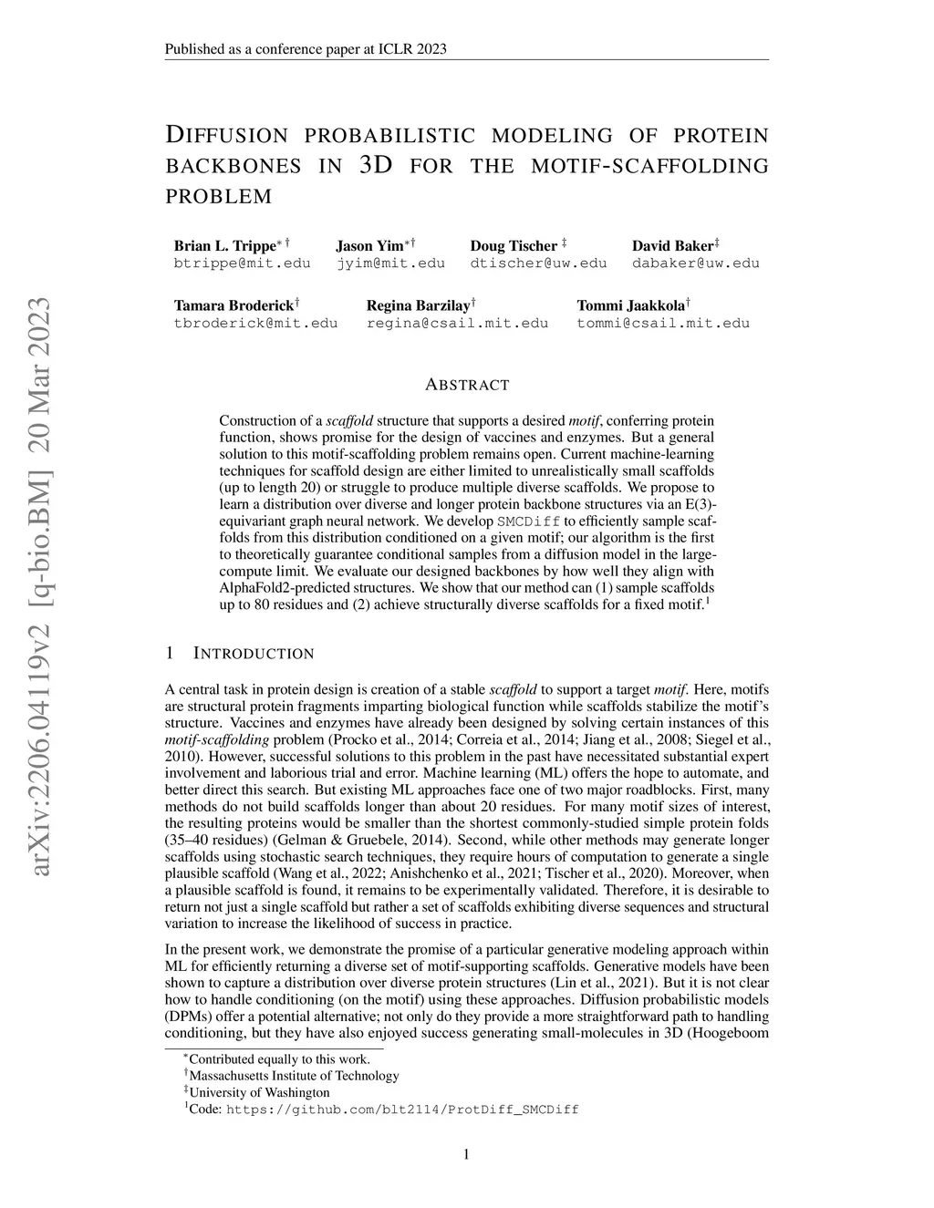 Construction of a scaffold structure that supports a desired motif, conferring protein function, shows promise for the design of vaccines and enzymes. But a general solution to this motif-scaffolding problem remains open. Current machine-learning techniques for scaffold design are either limited to unrealistically small scaffolds (up to length 20) or struggle to produce multiple diverse scaffolds. We propose to learn a distribution over diverse and longer protein backbone structures via an E(3)-equivariant graph neural network. We develop SMCDiff to efficiently sample scaffolds from this distribution conditioned on a given motif; our algorithm is the first to theoretically guarantee conditional samples from a diffusion model in the large-compute limit. We evaluate our designed backbones by how well they align with AlphaFold2-predicted structures. We show that our method can (1) sample scaffolds up to 80 residues and (2) achieve structurally diverse scaffolds for a fixed motif.