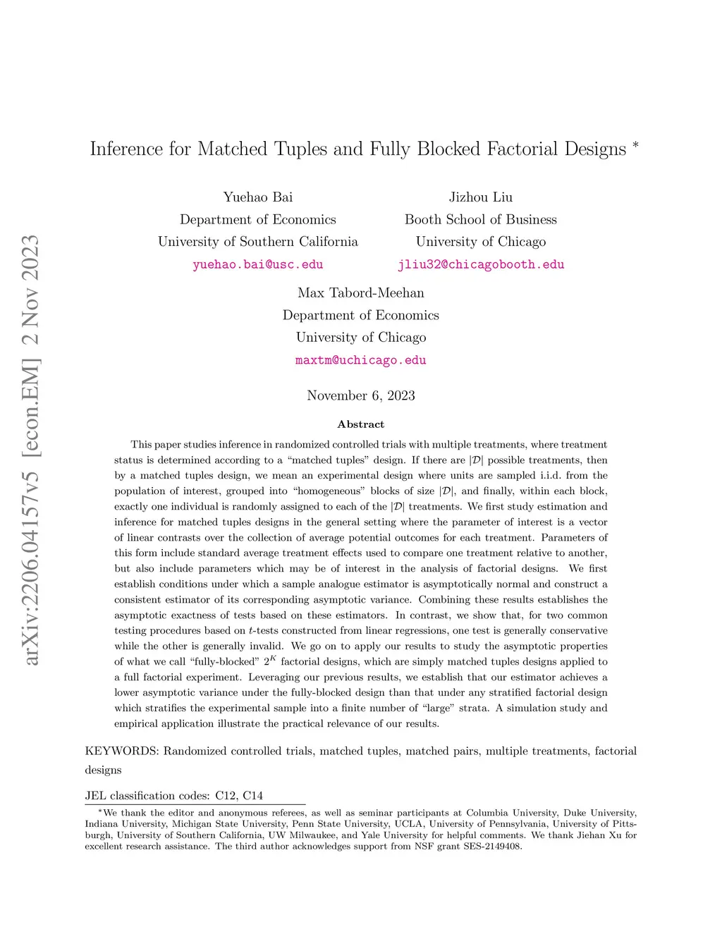 This paper studies inference in randomized controlled trials with multiple treatments, where treatment status is determined according to a "matched tuples" design. Here, by a matched tuples design, we mean an experimental design where units are sampled i.i.d. from the population of interest, grouped into "homogeneous" blocks with cardinality equal to the number of treatments, and finally, within each block, each treatment is assigned exactly once uniformly at random. We first study estimation and inference for matched tuples designs in the general setting where the parameter of interest is a vector of linear contrasts over the collection of average potential outcomes for each treatment. Parameters of this form include standard average treatment effects used to compare one treatment relative to another, but also include parameters which may be of interest in the analysis of factorial designs. We first establish conditions under which a sample analogue estimator is asymptotically normal and construct a consistent estimator of its corresponding asymptotic variance. Combining these results establishes the asymptotic exactness of tests based on these estimators. In contrast, we show that, for two common testing procedures based on t-tests constructed from linear regressions, one test is generally conservative while the other generally invalid. We go on to apply our results to study the asymptotic properties of what we call "fully-blocked" 2^K factorial designs, which are simply matched tuples designs applied to a full factorial experiment. Leveraging our previous results, we establish that our estimator achieves a lower asymptotic variance under the fully-blocked design than that under any stratified factorial design which stratifies the experimental sample into a finite number of "large" strata. A simulation study and empirical application illustrate the practical relevance of our results.