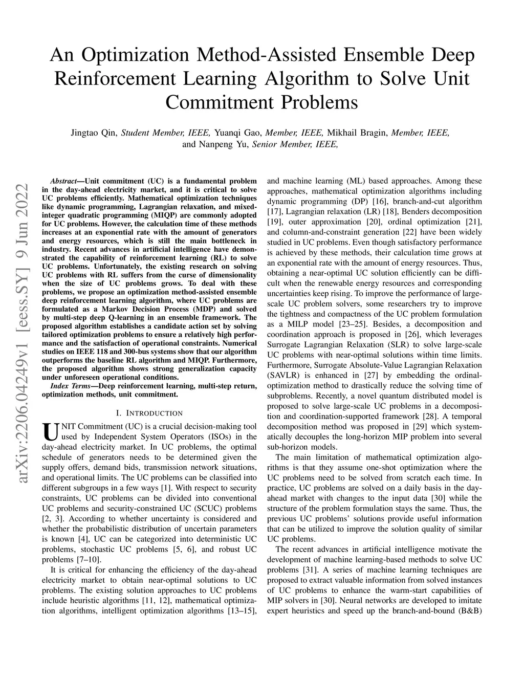 Unit commitment (UC) is a fundamental problem in the day-ahead electricity market, and it is critical to solve UC problems efficiently. Mathematical optimization techniques like dynamic programming, Lagrangian relaxation, and mixed-integer quadratic programming (MIQP) are commonly adopted for UC problems. However, the calculation time of these methods increases at an exponential rate with the amount of generators and energy resources, which is still the main bottleneck in industry. Recent advances in artificial intelligence have demonstrated the capability of reinforcement learning (RL) to solve UC problems. Unfortunately, the existing research on solving UC problems with RL suffers from the curse of dimensionality when the size of UC problems grows. To deal with these problems, we propose an optimization method-assisted ensemble deep reinforcement learning algorithm, where UC problems are formulated as a Markov Decision Process (MDP) and solved by multi-step deep Q-learning in an ensemble framework. The proposed algorithm establishes a candidate action set by solving tailored optimization problems to ensure a relatively high performance and the satisfaction of operational constraints. Numerical studies on IEEE 118 and 300-bus systems show that our algorithm outperforms the baseline RL algorithm and MIQP. Furthermore, the proposed algorithm shows strong generalization capacity under unforeseen operational conditions.