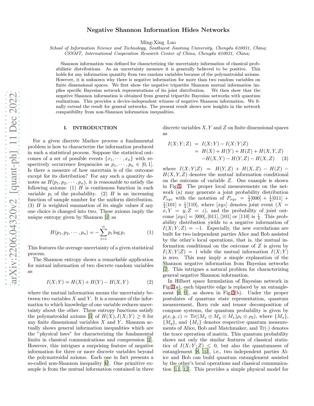 Shannon information was defined for characterizing the uncertainty information of classical probabilistic distributions. As an uncertainty measure it is generally believed to be positive. This holds for any information quantity from two random variables because of the polymatroidal axioms. However, it is unknown why there is negative information for more than two random variables on finite dimensional spaces. We first show the negative tripartite Shannon mutual information implies specific Bayesian network representations of its joint distribution. We then show that the negative Shannon information is obtained from general tripartite Bayesian networks with quantum realizations. This provides a device-independent witness of negative Shannon information. We finally extend the result for general networks. The present result shows new insights in the network compatibility from non-Shannon information inequalities.
