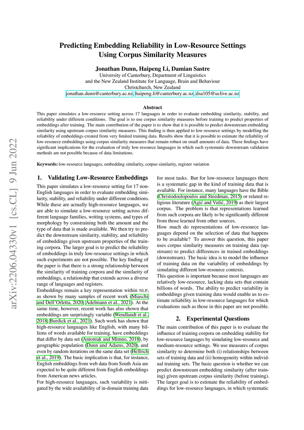 This paper simulates a low-resource setting across 17 languages in order to evaluate embedding similarity, stability, and reliability under different conditions. The goal is to use corpus similarity measures before training to predict properties of embeddings after training. The main contribution of the paper is to show that it is possible to predict downstream embedding similarity using upstream corpus similarity measures. This finding is then applied to low-resource settings by modelling the reliability of embeddings created from very limited training data. Results show that it is possible to estimate the reliability of low-resource embeddings using corpus similarity measures that remain robust on small amounts of data. These findings have significant implications for the evaluation of truly low-resource languages in which such systematic downstream validation methods are not possible because of data limitations.