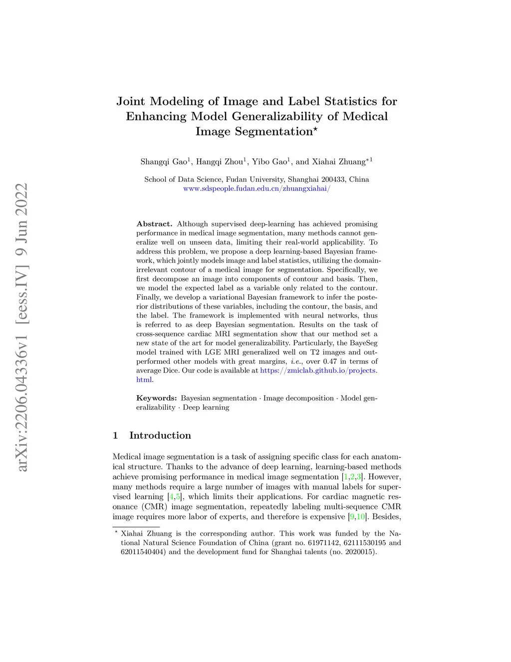 Although supervised deep-learning has achieved promising performance in medical image segmentation, many methods cannot generalize well on unseen data, limiting their real-world applicability. To address this problem, we propose a deep learning-based Bayesian framework, which jointly models image and label statistics, utilizing the domain-irrelevant contour of a medical image for segmentation. Specifically, we first decompose an image into components of contour and basis. Then, we model the expected label as a variable only related to the contour. Finally, we develop a variational Bayesian framework to infer the posterior distributions of these variables, including the contour, the basis, and the label. The framework is implemented with neural networks, thus is referred to as deep Bayesian segmentation. Results on the task of cross-sequence cardiac MRI segmentation show that our method set a new state of the art for model generalizability. Particularly, the BayeSeg model trained with LGE MRI generalized well on T2 images and outperformed other models with great margins, i.e., over 0.47 in terms of average Dice. Our code is available at https://zmiclab.github.io/projects.html.