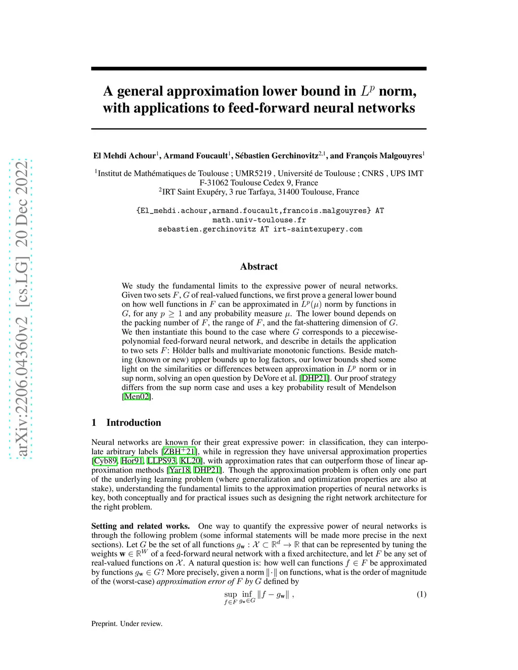 We study the fundamental limits to the expressive power of neural networks. Given two sets , of real-valued functions, we first prove a general lower bound on how well functions in can be approximated in norm by functions in , for any and any probability measure . The lower bound depends on the packing number of , the range of , and the fat-shattering dimension of . We then instantiate this bound to the case where corresponds to a piecewise-polynomial feed-forward neural network, and describe in details the application to two sets : H{\"o}lder balls and multivariate monotonic functions. Beside matching (known or new) upper bounds up to log factors, our lower bounds shed some light on the similarities or differences between approximation in norm or in sup norm, solving an open question by DeVore et al. (2021). Our proof strategy differs from the sup norm case and uses a key probability result of Mendelson (2002).