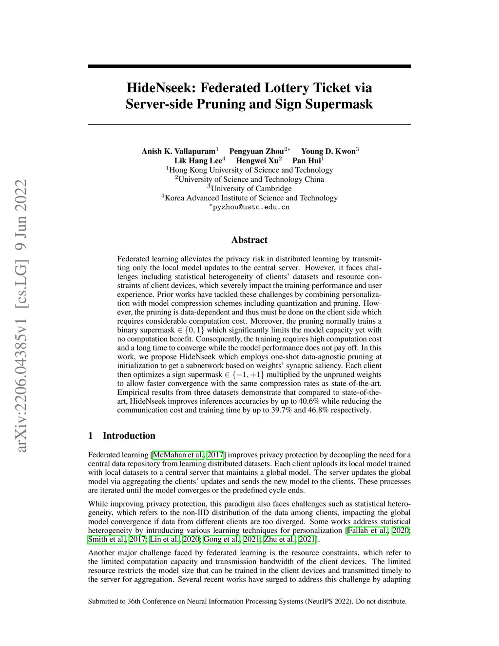 Federated learning alleviates the privacy risk in distributed learning by transmitting only the local model updates to the central server. However, it faces challenges including statistical heterogeneity of clients' datasets and resource constraints of client devices, which severely impact the training performance and user experience. Prior works have tackled these challenges by combining personalization with model compression schemes including quantization and pruning. However, the pruning is data-dependent and thus must be done on the client side which requires considerable computation cost. Moreover, the pruning normally trains a binary supermask which significantly limits the model capacity yet with no computation benefit. Consequently, the training requires high computation cost and a long time to converge while the model performance does not pay off. In this work, we propose HideNseek which employs one-shot data-agnostic pruning at initialization to get a subnetwork based on weights' synaptic saliency. Each client then optimizes a sign supermask multiplied by the unpruned weights to allow faster convergence with the same compression rates as state-of-the-art. Empirical results from three datasets demonstrate that compared to state-of-the-art, HideNseek improves inferences accuracies by up to 40.6\% while reducing the communication cost and training time by up to 39.7\% and 46.8\% respectively.