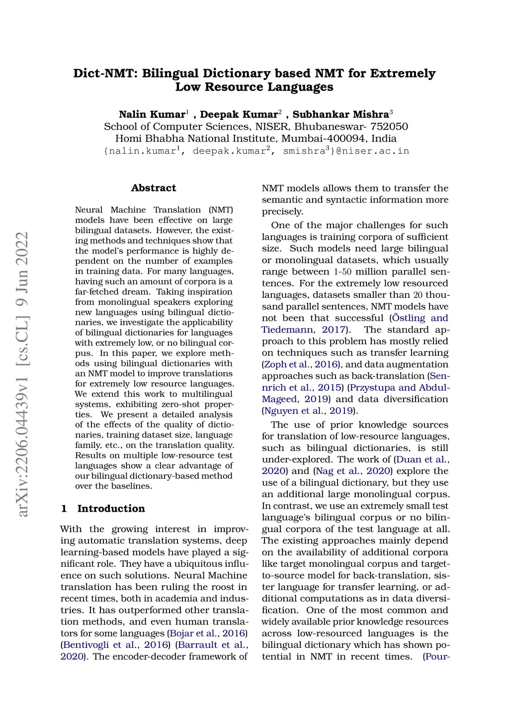 Dict-NMT: Bilingual Dictionary based NMT for Extremely Low Resource