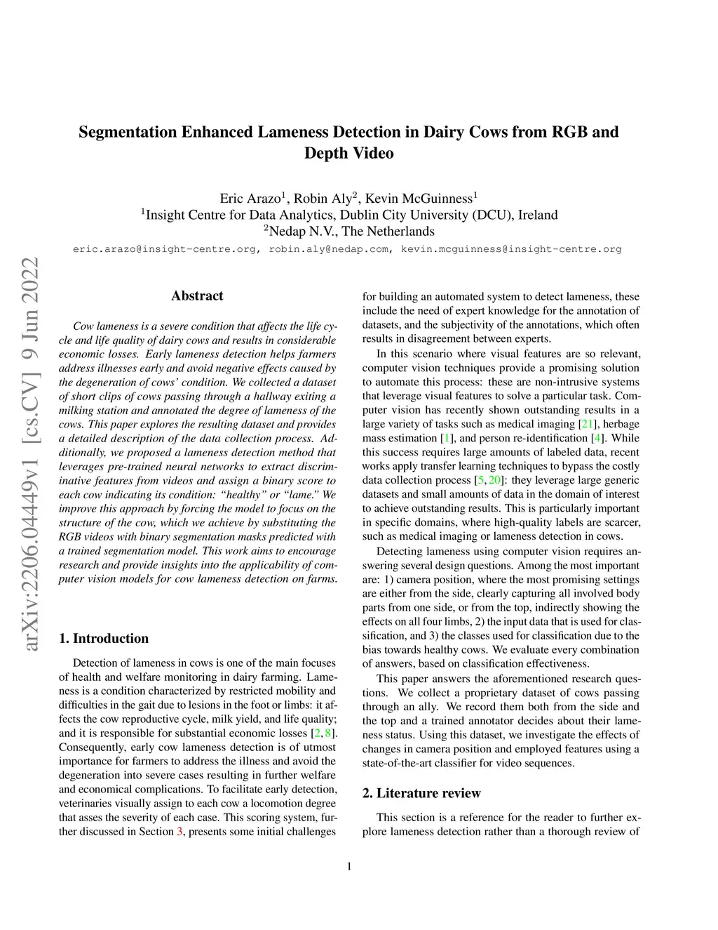 Cow lameness is a severe condition that affects the life cycle and life quality of dairy cows and results in considerable economic losses. Early lameness detection helps farmers address illnesses early and avoid negative effects caused by the degeneration of cows' condition. We collected a dataset of short clips of cows passing through a hallway exiting a milking station and annotated the degree of lameness of the cows. This paper explores the resulting dataset and provides a detailed description of the data collection process. Additionally, we proposed a lameness detection method that leverages pre-trained neural networks to extract discriminative features from videos and assign a binary score to each cow indicating its condition: "healthy" or "lame." We improve this approach by forcing the model to focus on the structure of the cow, which we achieve by substituting the RGB videos with binary segmentation masks predicted with a trained segmentation model. This work aims to encourage research and provide insights into the applicability of computer vision models for cow lameness detection on farms.