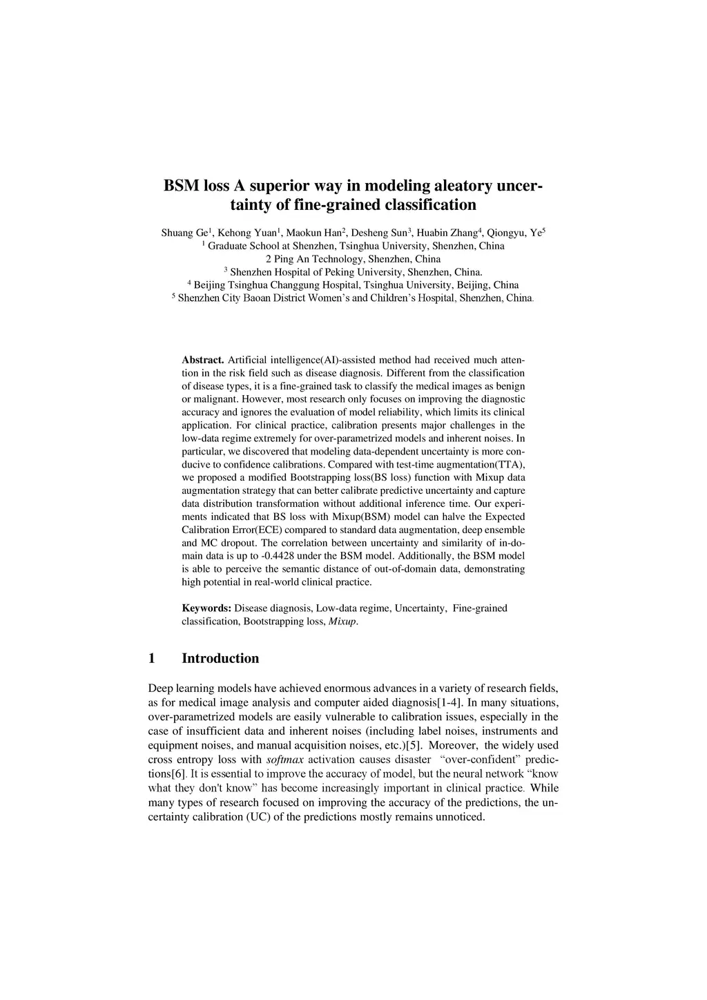 Artificial intelligence(AI)-assisted method had received much attention in the risk field such as disease diagnosis. Different from the classification of disease types, it is a fine-grained task to classify the medical images as benign or malignant. However, most research only focuses on improving the diagnostic accuracy and ignores the evaluation of model reliability, which limits its clinical application. For clinical practice, calibration presents major challenges in the low-data regime extremely for over-parametrized models and inherent noises. In particular, we discovered that modeling data-dependent uncertainty is more conducive to confidence calibrations. Compared with test-time augmentation(TTA), we proposed a modified Bootstrapping loss(BS loss) function with Mixup data augmentation strategy that can better calibrate predictive uncertainty and capture data distribution transformation without additional inference time. Our experiments indicated that BS loss with Mixup(BSM) model can halve the Expected Calibration Error(ECE) compared to standard data augmentation, deep ensemble and MC dropout. The correlation between uncertainty and similarity of in-domain data is up to -0.4428 under the BSM model. Additionally, the BSM model is able to perceive the semantic distance of out-of-domain data, demonstrating high potential in real-world clinical practice.