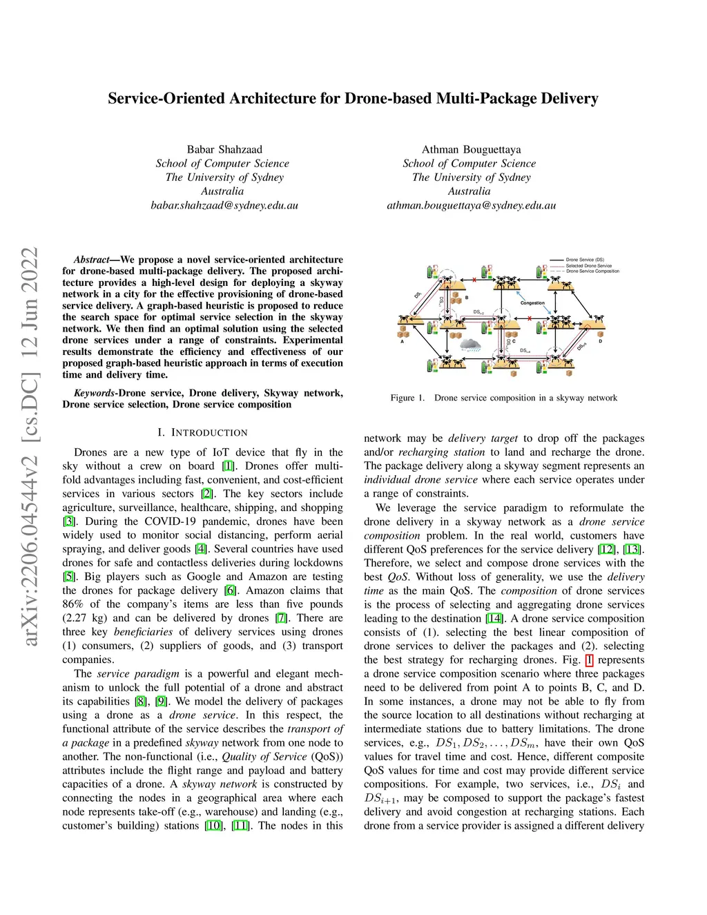 We propose a novel service-oriented architecture for drone-based multi-package delivery in a skyway network. The proposed architecture provides a high-level design for deploying a skyway network in a city for the effective provisioning of drone services. We propose a graph-based heuristic to reduce the search space for optimal service selection in the skyway network. We then find an optimal solution using the selected drone services under a set of constraints. We conduct experiments to demonstrate the efficiency of our proposed approach.