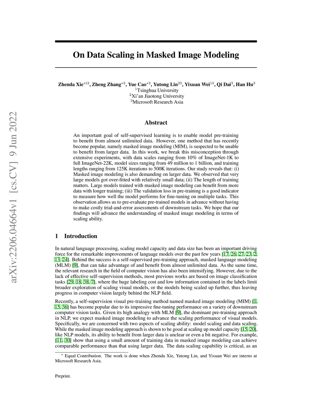 An important goal of self-supervised learning is to enable model pre-training to benefit from almost unlimited data. However, one method that has recently become popular, namely masked image modeling (MIM), is suspected to be unable to benefit from larger data. In this work, we break this misconception through extensive experiments, with data scales ranging from 10\% of ImageNet-1K to full ImageNet-22K, model sizes ranging from 49 million to 1 billion, and training lengths ranging from 125K iterations to 500K iterations. Our study reveals that: (i) Masked image modeling is also demanding on larger data. We observed that very large models got over-fitted with relatively small data; (ii) The length of training matters. Large models trained with masked image modeling can benefit from more data with longer training; (iii) The validation loss in pre-training is a good indicator to measure how well the model performs for fine-tuning on multiple tasks. This observation allows us to pre-evaluate pre-trained models in advance without having to make costly trial-and-error assessments of downstream tasks. We hope that our findings will advance the understanding of masked image modeling in terms of scaling ability.
