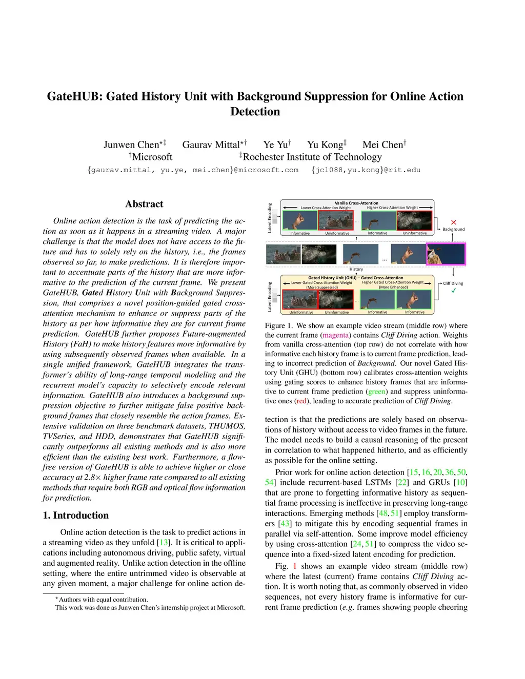 Online action detection is the task of predicting the action as soon as it happens in a streaming video. A major challenge is that the model does not have access to the future and has to solely rely on the history, i.e., the frames observed so far, to make predictions. It is therefore important to accentuate parts of the history that are more informative to the prediction of the current frame. We present GateHUB, Gated History Unit with Background Suppression, that comprises a novel position-guided gated cross-attention mechanism to enhance or suppress parts of the history as per how informative they are for current frame prediction. GateHUB further proposes Future-augmented History (FaH) to make history features more informative by using subsequently observed frames when available. In a single unified framework, GateHUB integrates the transformer's ability of long-range temporal modeling and the recurrent model's capacity to selectively encode relevant information. GateHUB also introduces a background suppression objective to further mitigate false positive background frames that closely resemble the action frames. Extensive validation on three benchmark datasets, THUMOS, TVSeries, and HDD, demonstrates that GateHUB significantly outperforms all existing methods and is also more efficient than the existing best work. Furthermore, a flow-free version of GateHUB is able to achieve higher or close accuracy at 2.8x higher frame rate compared to all existing methods that require both RGB and optical flow information for prediction.