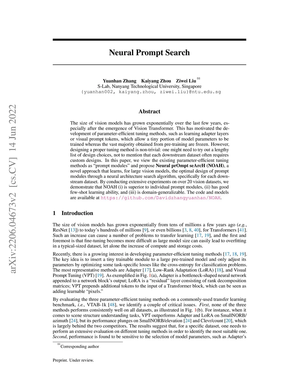 The size of vision models has grown exponentially over the last few years, especially after the emergence of Vision Transformer. This has motivated the development of parameter-efficient tuning methods, such as learning adapter layers or visual prompt tokens, which allow a tiny portion of model parameters to be trained whereas the vast majority obtained from pre-training are frozen. However, designing a proper tuning method is non-trivial: one might need to try out a lengthy list of design choices, not to mention that each downstream dataset often requires custom designs. In this paper, we view the existing parameter-efficient tuning methods as "prompt modules" and propose Neural prOmpt seArcH (NOAH), a novel approach that learns, for large vision models, the optimal design of prompt modules through a neural architecture search algorithm, specifically for each downstream dataset. By conducting extensive experiments on over 20 vision datasets, we demonstrate that NOAH (i) is superior to individual prompt modules, (ii) has a good few-shot learning ability, and (iii) is domain-generalizable. The code and models are available at https://github.com/Davidzhangyuanhan/NOAH.