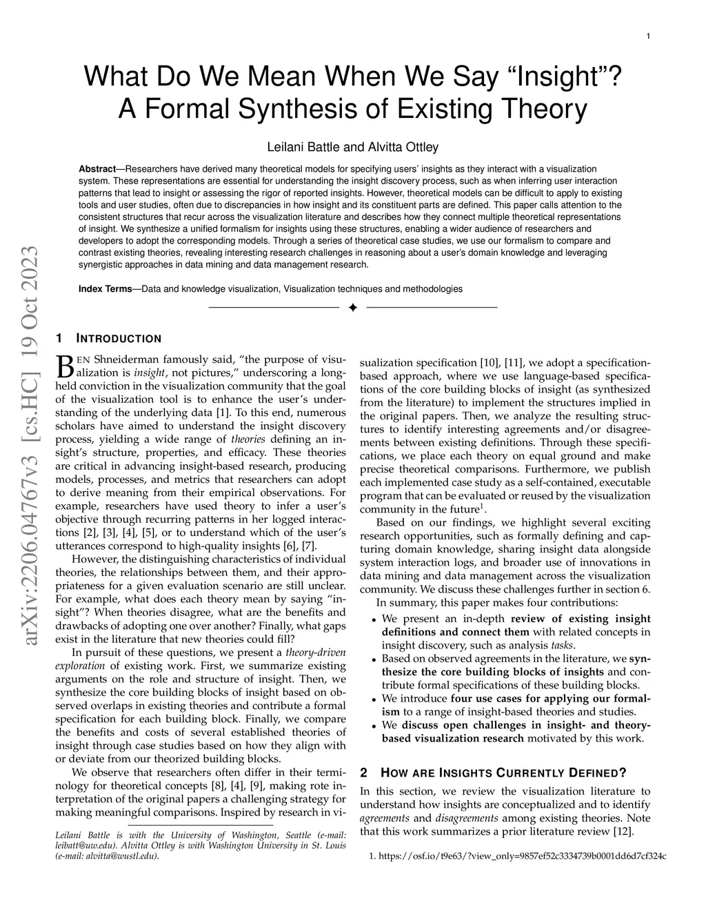 Researchers have derived many theoretical models for specifying users' insights as they interact with a visualization system. These representations are essential for understanding the insight discovery process, such as when inferring user interaction patterns that lead to insight or assessing the rigor of reported insights. However, theoretical models can be difficult to apply to existing tools and user studies, often due to discrepancies in how insight and its constituent parts are defined. This paper calls attention to the consistent structures that recur across the visualization literature and describes how they connect multiple theoretical representations of insight. We synthesize a unified formalism for insights using these structures, enabling a wider audience of researchers and developers to adopt the corresponding models. Through a series of theoretical case studies, we use our formalism to compare and contrast existing theories, revealing interesting research challenges in reasoning about a user's domain knowledge and leveraging synergistic approaches in data mining and data management research.
