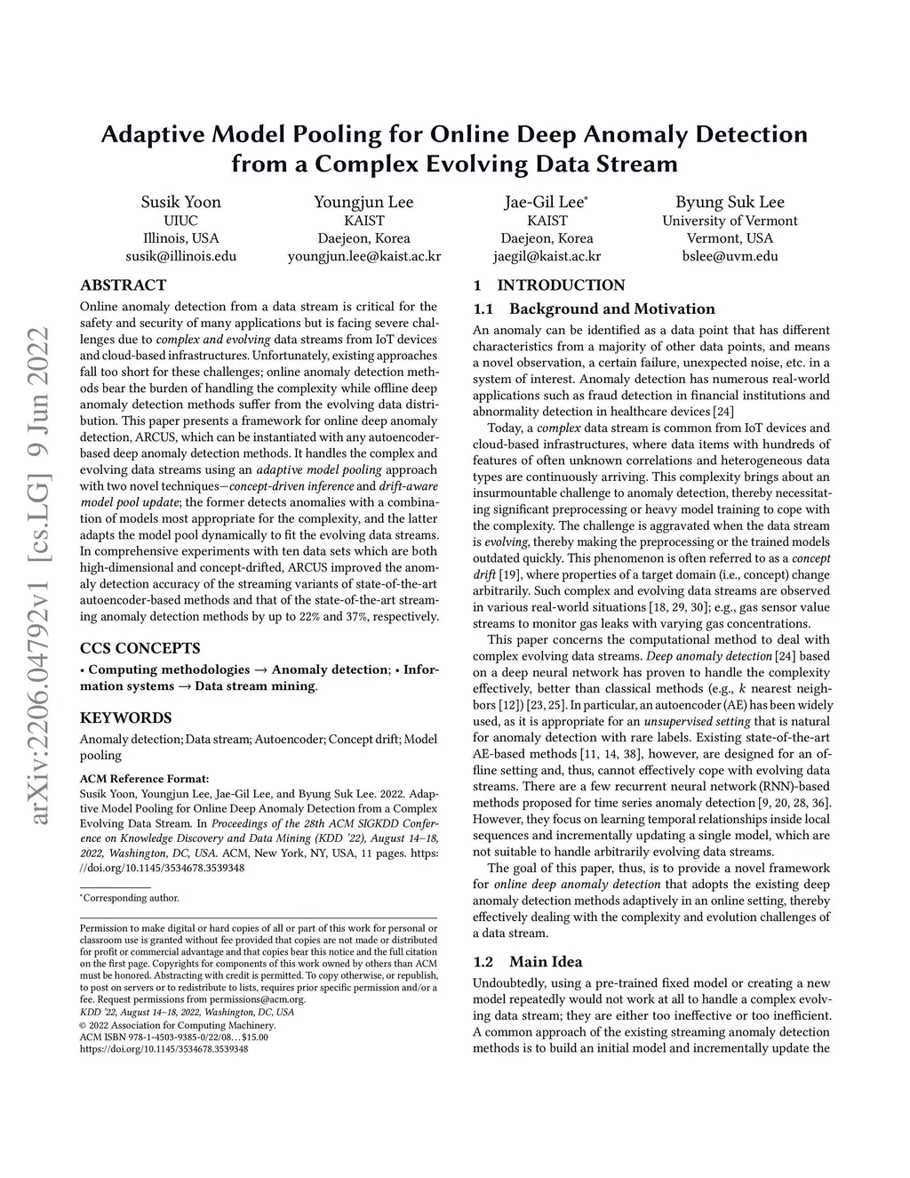 Online anomaly detection from a data stream is critical for the safety and security of many applications but is facing severe challenges due to complex and evolving data streams from IoT devices and cloud-based infrastructures. Unfortunately, existing approaches fall too short for these challenges; online anomaly detection methods bear the burden of handling the complexity while offline deep anomaly detection methods suffer from the evolving data distribution. This paper presents a framework for online deep anomaly detection, ARCUS, which can be instantiated with any autoencoder-based deep anomaly detection methods. It handles the complex and evolving data streams using an adaptive model pooling approach with two novel techniques: concept-driven inference and drift-aware model pool update; the former detects anomalies with a combination of models most appropriate for the complexity, and the latter adapts the model pool dynamically to fit the evolving data streams. In comprehensive experiments with ten data sets which are both high-dimensional and concept-drifted, ARCUS improved the anomaly detection accuracy of the streaming variants of state-of-the-art autoencoder-based methods and that of the state-of-the-art streaming anomaly detection methods by up to 22% and 37%, respectively.