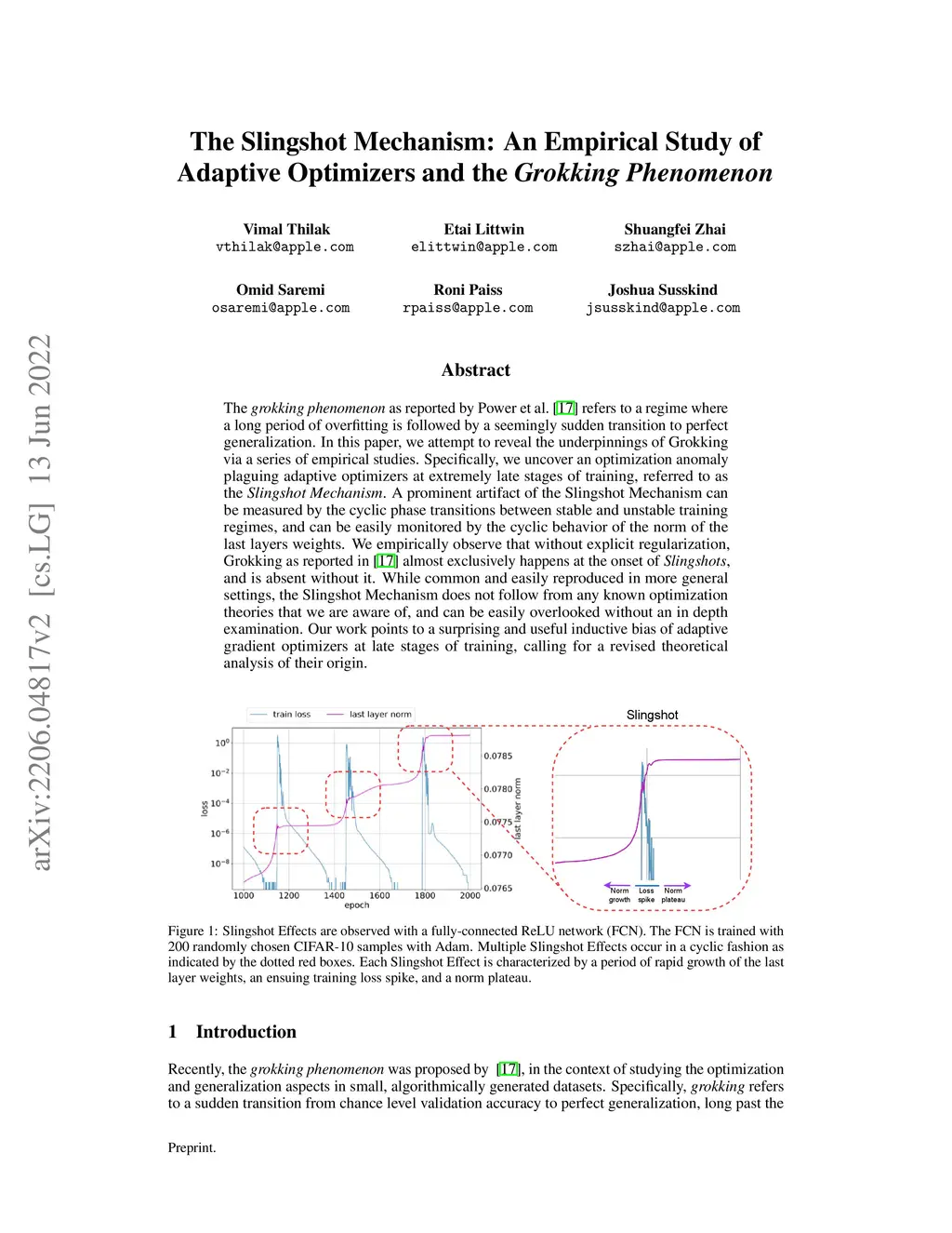 The grokking phenomenon as reported by Power et al. ( arXiv:2201.02177 ) refers to a regime where a long period of overfitting is followed by a seemingly sudden transition to perfect generalization. In this paper, we attempt to reveal the underpinnings of Grokking via a series of empirical studies. Specifically, we uncover an optimization anomaly plaguing adaptive optimizers at extremely late stages of training, referred to as the Slingshot Mechanism. A prominent artifact of the Slingshot Mechanism can be measured by the cyclic phase transitions between stable and unstable training regimes, and can be easily monitored by the cyclic behavior of the norm of the last layers weights. We empirically observe that without explicit regularization, Grokking as reported in ( arXiv:2201.02177 ) almost exclusively happens at the onset of Slingshots, and is absent without it. While common and easily reproduced in more general settings, the Slingshot Mechanism does not follow from any known optimization theories that we are aware of, and can be easily overlooked without an in depth examination. Our work points to a surprising and useful inductive bias of adaptive gradient optimizers at late stages of training, calling for a revised theoretical analysis of their origin.