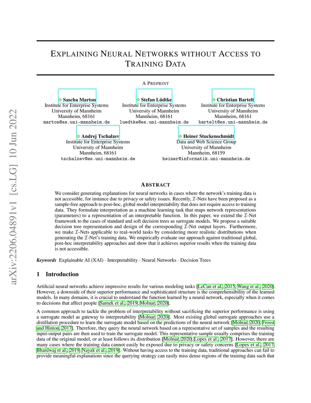 We consider generating explanations for neural networks in cases where the network's training data is not accessible, for instance due to privacy or safety issues. Recently, -Nets have been proposed as a sample-free approach to post-hoc, global model interpretability that does not require access to training data. They formulate interpretation as a machine learning task that maps network representations (parameters) to a representation of an interpretable function. In this paper, we extend the -Net framework to the cases of standard and soft decision trees as surrogate models. We propose a suitable decision tree representation and design of the corresponding -Net output layers. Furthermore, we make -Nets applicable to real-world tasks by considering more realistic distributions when generating the -Net's training data. We empirically evaluate our approach against traditional global, post-hoc interpretability approaches and show that it achieves superior results when the training data is not accessible.