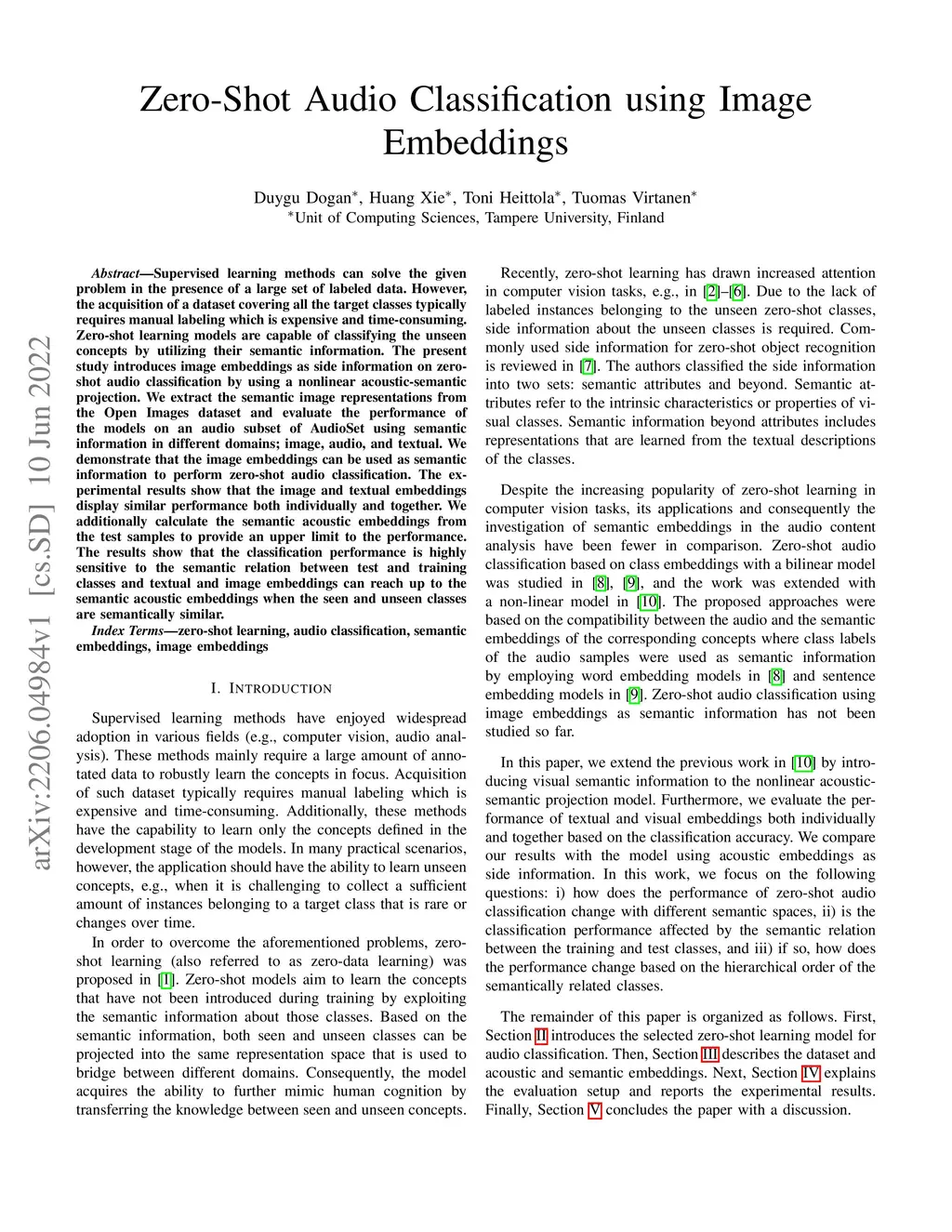 Supervised learning methods can solve the given problem in the presence of a large set of labeled data. However, the acquisition of a dataset covering all the target classes typically requires manual labeling which is expensive and time-consuming. Zero-shot learning models are capable of classifying the unseen concepts by utilizing their semantic information. The present study introduces image embeddings as side information on zero-shot audio classification by using a nonlinear acoustic-semantic projection. We extract the semantic image representations from the Open Images dataset and evaluate the performance of the models on an audio subset of AudioSet using semantic information in different domains; image, audio, and textual. We demonstrate that the image embeddings can be used as semantic information to perform zero-shot audio classification. The experimental results show that the image and textual embeddings display similar performance both individually and together. We additionally calculate the semantic acoustic embeddings from the test samples to provide an upper limit to the performance. The results show that the classification performance is highly sensitive to the semantic relation between test and training classes and textual and image embeddings can reach up to the semantic acoustic embeddings when the seen and unseen classes are semantically similar.