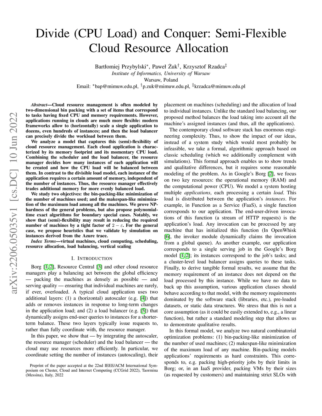 Cloud resource management is often modeled by two-dimensional bin packing with a set of items that correspond to tasks having fixed CPU and memory requirements. However, applications running in clouds are much more flexible: modern frameworks allow to (horizontally) scale a single application to dozens, even hundreds of instances; and then the load balancer can precisely divide the workload between them. We analyze a model that captures this (semi)-flexibility of cloud resource management. Each cloud application is characterized by its memory footprint and its momentary CPU load. Combining the scheduler and the load balancer, the resource manager decides how many instances of each application will be created and how the CPU load will be balanced between them. In contrast to the divisible load model, each instance of the application requires a certain amount of memory, independent of the number of instances. Thus, the resource manager effectively trades additional memory for more evenly balanced load. We study two objectives: the bin-packing-like minimization of the number of machines used; and the makespan-like minimization of the maximum load among all the machines. We prove NP-hardness of the general problems, but also propose polynomial-time exact algorithms for boundary special cases. Notably, we show that (semi)-flexibility may result in reducing the required number of machines by a tight factor of . For the general case, we propose heuristics that we validate by simulation on instances derived from the Azure trace.