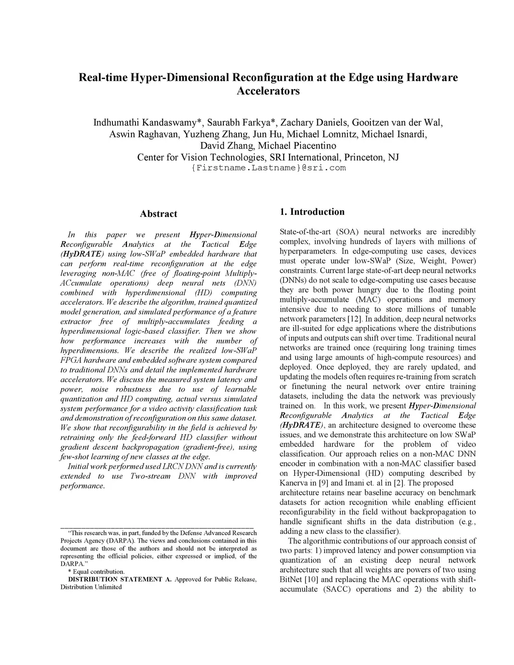 In this paper we present Hyper-Dimensional Reconfigurable Analytics at the Tactical Edge (HyDRATE) using low-SWaP embedded hardware that can perform real-time reconfiguration at the edge leveraging non-MAC (free of floating-point MultiplyACcumulate operations) deep neural nets (DNN) combined with hyperdimensional (HD) computing accelerators. We describe the algorithm, trained quantized model generation, and simulated performance of a feature extractor free of multiply-accumulates feeding a hyperdimensional logic-based classifier. Then we show how performance increases with the number of hyperdimensions. We describe the realized low-SWaP FPGA hardware and embedded software system compared to traditional DNNs and detail the implemented hardware accelerators. We discuss the measured system latency and power, noise robustness due to use of learnable quantization and HD computing, actual versus simulated system performance for a video activity classification task and demonstration of reconfiguration on this same dataset. We show that reconfigurability in the field is achieved by retraining only the feed-forward HD classifier without gradient descent backpropagation (gradient-free), using few-shot learning of new classes at the edge. Initial work performed used LRCN DNN and is currently extended to use Two-stream DNN with improved performance.