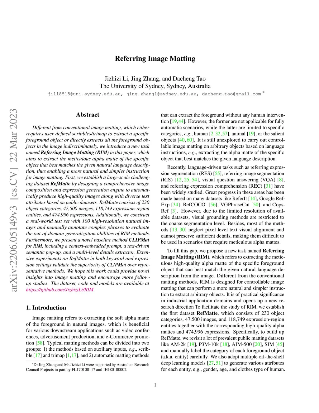 Different from conventional image matting, which either requires user-defined scribbles/trimap to extract a specific foreground object or directly extracts all the foreground objects in the image indiscriminately, we introduce a new task named Referring Image Matting (RIM) in this paper, which aims to extract the meticulous alpha matte of the specific object that best matches the given natural language description, thus enabling a more natural and simpler instruction for image matting. First, we establish a large-scale challenging dataset RefMatte by designing a comprehensive image composition and expression generation engine to automatically produce high-quality images along with diverse text attributes based on public datasets. RefMatte consists of 230 object categories, 47,500 images, 118,749 expression-region entities, and 474,996 expressions. Additionally, we construct a real-world test set with 100 high-resolution natural images and manually annotate complex phrases to evaluate the out-of-domain generalization abilities of RIM methods. Furthermore, we present a novel baseline method CLIPMat for RIM, including a context-embedded prompt, a text-driven semantic pop-up, and a multi-level details extractor. Extensive experiments on RefMatte in both keyword and expression settings validate the superiority of CLIPMat over representative methods. We hope this work could provide novel insights into image matting and encourage more follow-up studies. The dataset, code and models are available at https://github.com/JizhiziLi/RIM.