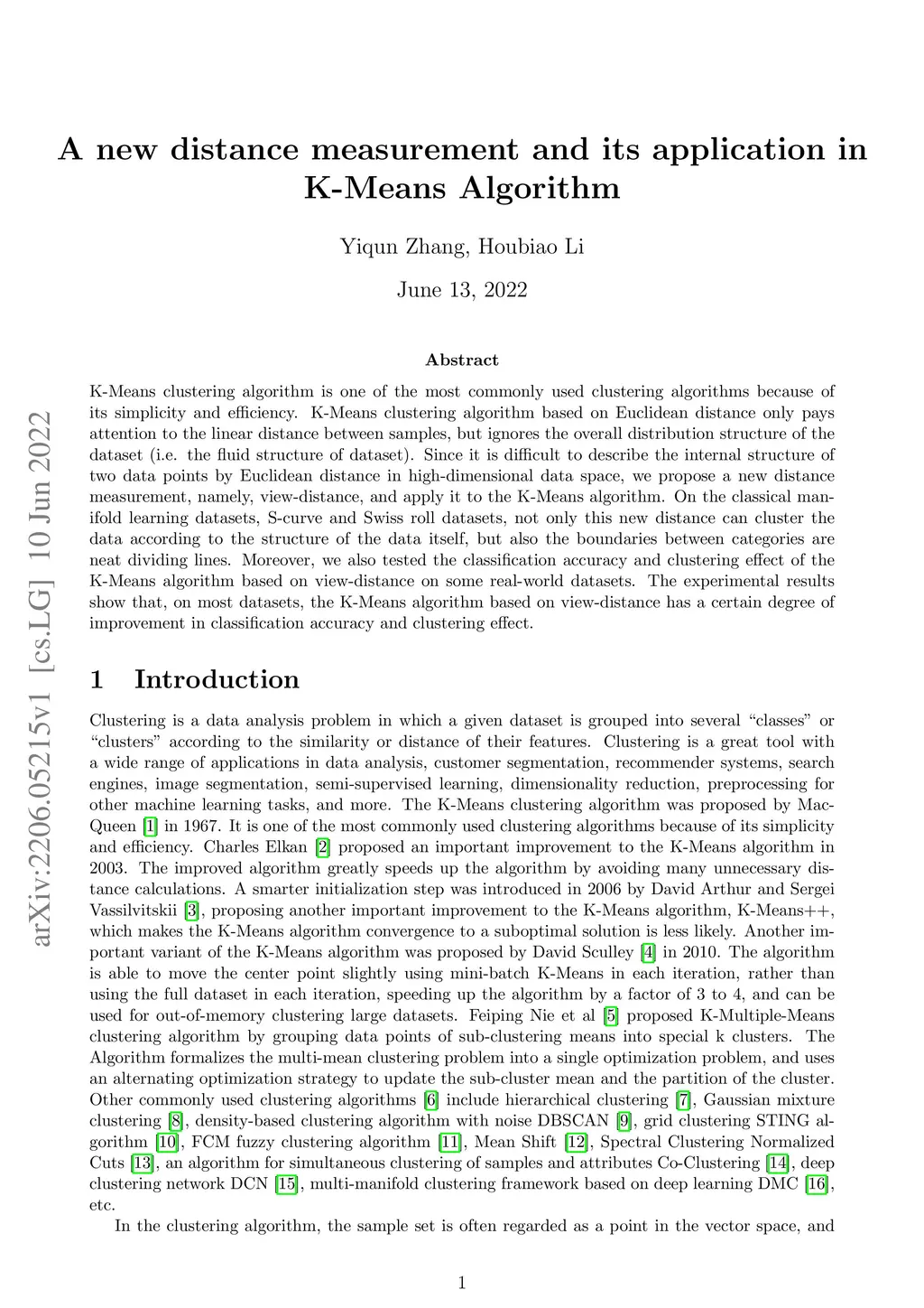 K-Means clustering algorithm is one of the most commonly used clustering algorithms because of its simplicity and efficiency. K-Means clustering algorithm based on Euclidean distance only pays attention to the linear distance between samples, but ignores the overall distribution structure of the dataset (i.e. the fluid structure of dataset). Since it is difficult to describe the internal structure of two data points by Euclidean distance in high-dimensional data space, we propose a new distance measurement, namely, view-distance, and apply it to the K-Means algorithm. On the classical manifold learning datasets, S-curve and Swiss roll datasets, not only this new distance can cluster the data according to the structure of the data itself, but also the boundaries between categories are neat dividing lines. Moreover, we also tested the classification accuracy and clustering effect of the K-Means algorithm based on view-distance on some real-world datasets. The experimental results show that, on most datasets, the K-Means algorithm based on view-distance has a certain degree of improvement in classification accuracy and clustering effect.