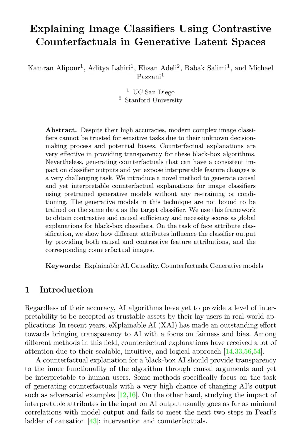 Despite their high accuracies, modern complex image classifiers cannot be trusted for sensitive tasks due to their unknown decision-making process and potential biases. Counterfactual explanations are very effective in providing transparency for these black-box algorithms. Nevertheless, generating counterfactuals that can have a consistent impact on classifier outputs and yet expose interpretable feature changes is a very challenging task. We introduce a novel method to generate causal and yet interpretable counterfactual explanations for image classifiers using pretrained generative models without any re-training or conditioning. The generative models in this technique are not bound to be trained on the same data as the target classifier. We use this framework to obtain contrastive and causal sufficiency and necessity scores as global explanations for black-box classifiers. On the task of face attribute classification, we show how different attributes influence the classifier output by providing both causal and contrastive feature attributions, and the corresponding counterfactual images.