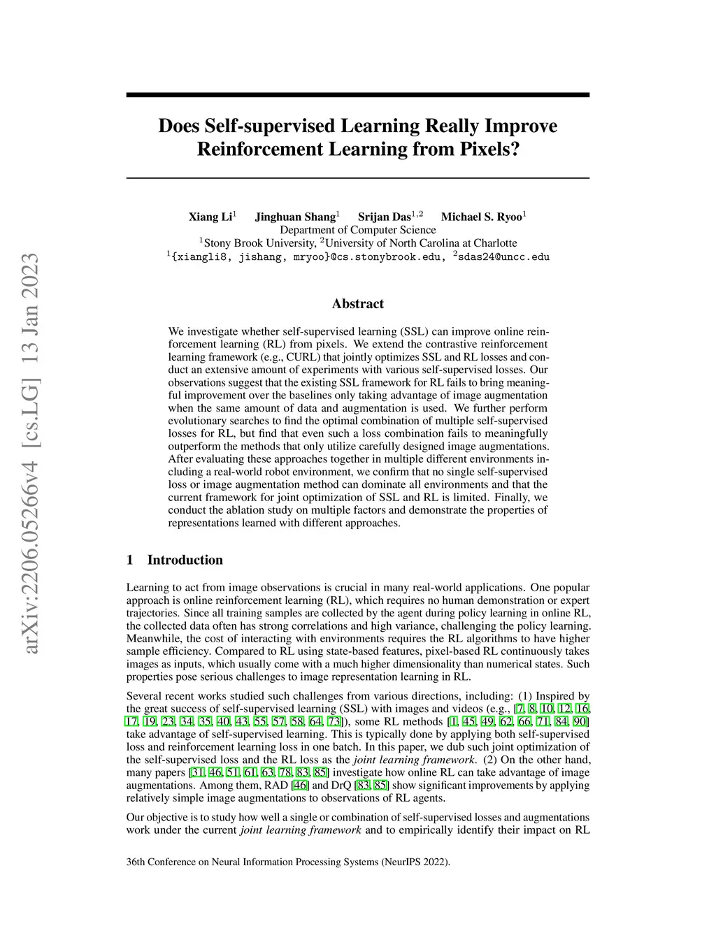 We investigate whether self-supervised learning (SSL) can improve online reinforcement learning (RL) from pixels. We extend the contrastive reinforcement learning framework (e.g., CURL) that jointly optimizes SSL and RL losses and conduct an extensive amount of experiments with various self-supervised losses. Our observations suggest that the existing SSL framework for RL fails to bring meaningful improvement over the baselines only taking advantage of image augmentation when the same amount of data and augmentation is used. We further perform evolutionary searches to find the optimal combination of multiple self-supervised losses for RL, but find that even such a loss combination fails to meaningfully outperform the methods that only utilize carefully designed image augmentations. After evaluating these approaches together in multiple different environments including a real-world robot environment, we confirm that no single self-supervised loss or image augmentation method can dominate all environments and that the current framework for joint optimization of SSL and RL is limited. Finally, we conduct the ablation study on multiple factors and demonstrate the properties of representations learned with different approaches.