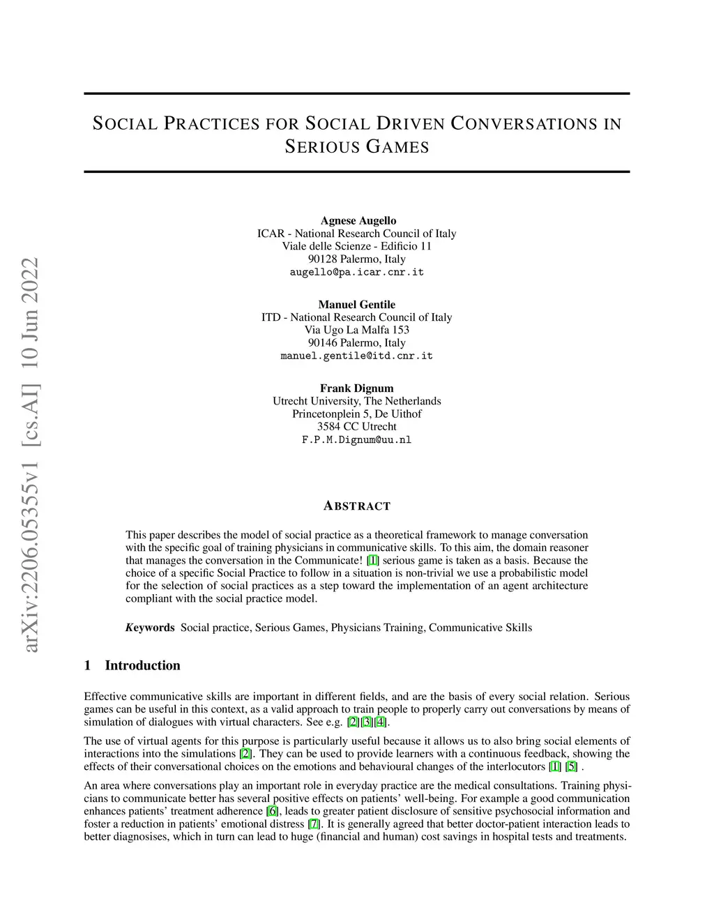 This paper describes the model of social practice as a theoretical framework to manage conversation with the specific goal of training physicians in communicative skills. To this aim, the domain reasoner that manages the conversation in the Communicate! \cite{jeuring} serious game is taken as a basis. Because the choice of a specific Social Practice to follow in a situation is non-trivial we use a probabilistic model for the selection of social practices as a step toward the implementation of an agent architecture compliant with the social practice model.