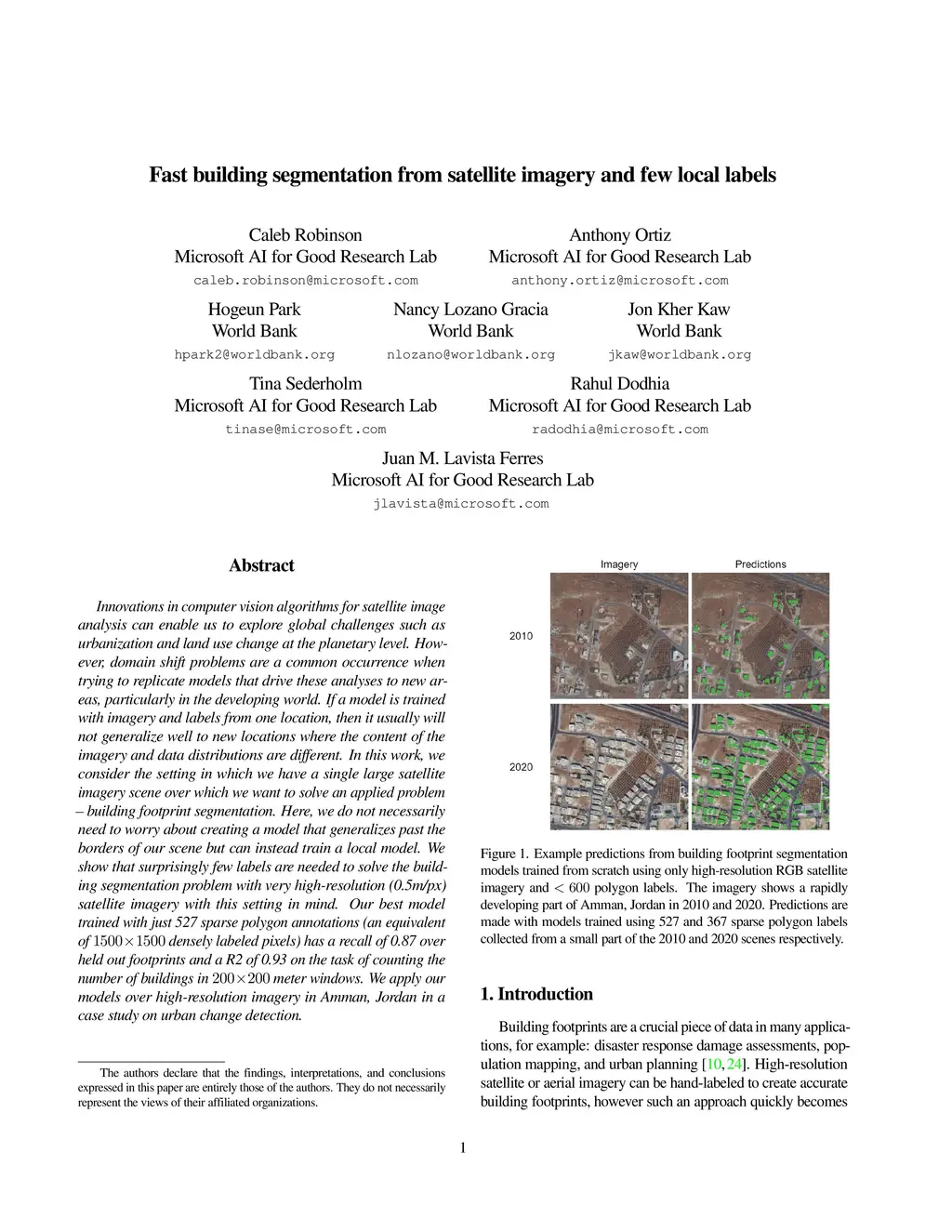Innovations in computer vision algorithms for satellite image analysis can enable us to explore global challenges such as urbanization and land use change at the planetary level. However, domain shift problems are a common occurrence when trying to replicate models that drive these analyses to new areas, particularly in the developing world. If a model is trained with imagery and labels from one location, then it usually will not generalize well to new locations where the content of the imagery and data distributions are different. In this work, we consider the setting in which we have a single large satellite imagery scene over which we want to solve an applied problem -- building footprint segmentation. Here, we do not necessarily need to worry about creating a model that generalizes past the borders of our scene but can instead train a local model. We show that surprisingly few labels are needed to solve the building segmentation problem with very high-resolution (0.5m/px) satellite imagery with this setting in mind. Our best model trained with just 527 sparse polygon annotations (an equivalent of 1500 x 1500 densely labeled pixels) has a recall of 0.87 over held out footprints and a R2 of 0.93 on the task of counting the number of buildings in 200 x 200-meter windows. We apply our models over high-resolution imagery in Amman, Jordan in a case study on urban change detection.