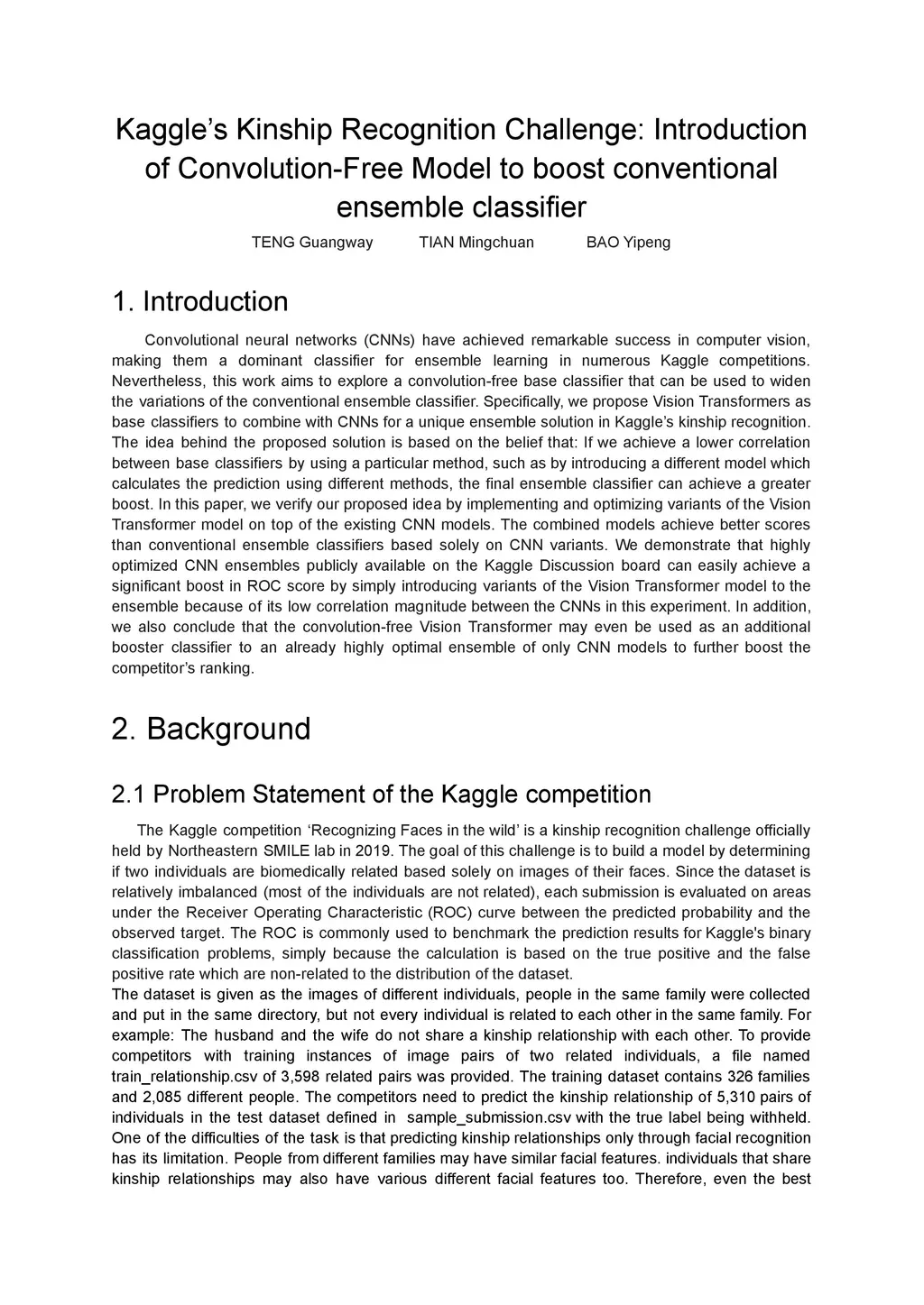 This work aims to explore a convolution-free base classifier that can be used to widen the variations of the conventional ensemble classifier. Specifically, we propose Vision Transformers as base classifiers to combine with CNNs for a unique ensemble solution in Kaggle kinship recognition. In this paper, we verify our proposed idea by implementing and optimizing variants of the Vision Transformer model on top of the existing CNN models. The combined models achieve better scores than conventional ensemble classifiers based solely on CNN variants. We demonstrate that highly optimized CNN ensembles publicly available on the Kaggle Discussion board can easily achieve a significant boost in ROC score by simply ensemble with variants of the Vision Transformer model due to low correlation.