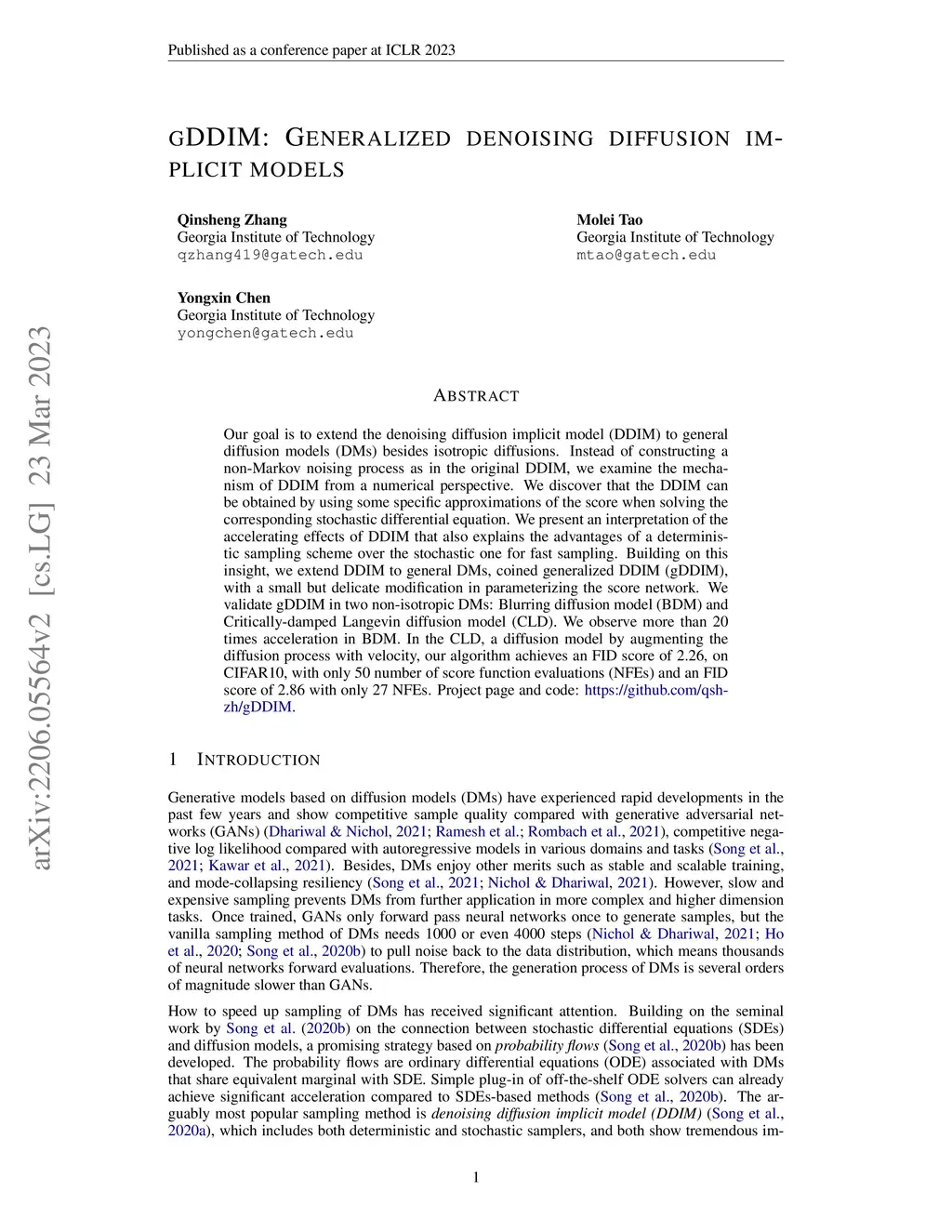 Our goal is to extend the denoising diffusion implicit model (DDIM) to general diffusion models~(DMs) besides isotropic diffusions. Instead of constructing a non-Markov noising process as in the original DDIM, we examine the mechanism of DDIM from a numerical perspective. We discover that the DDIM can be obtained by using some specific approximations of the score when solving the corresponding stochastic differential equation. We present an interpretation of the accelerating effects of DDIM that also explains the advantages of a deterministic sampling scheme over the stochastic one for fast sampling. Building on this insight, we extend DDIM to general DMs, coined generalized DDIM (gDDIM), with a small but delicate modification in parameterizing the score network. We validate gDDIM in two non-isotropic DMs: Blurring diffusion model (BDM) and Critically-damped Langevin diffusion model (CLD). We observe more than 20 times acceleration in BDM. In the CLD, a diffusion model by augmenting the diffusion process with velocity, our algorithm achieves an FID score of 2.26, on CIFAR10, with only 50 number of score function evaluations~(NFEs) and an FID score of 2.86 with only 27 NFEs. Code is available at https://github.com/qsh-zh/gDDIM