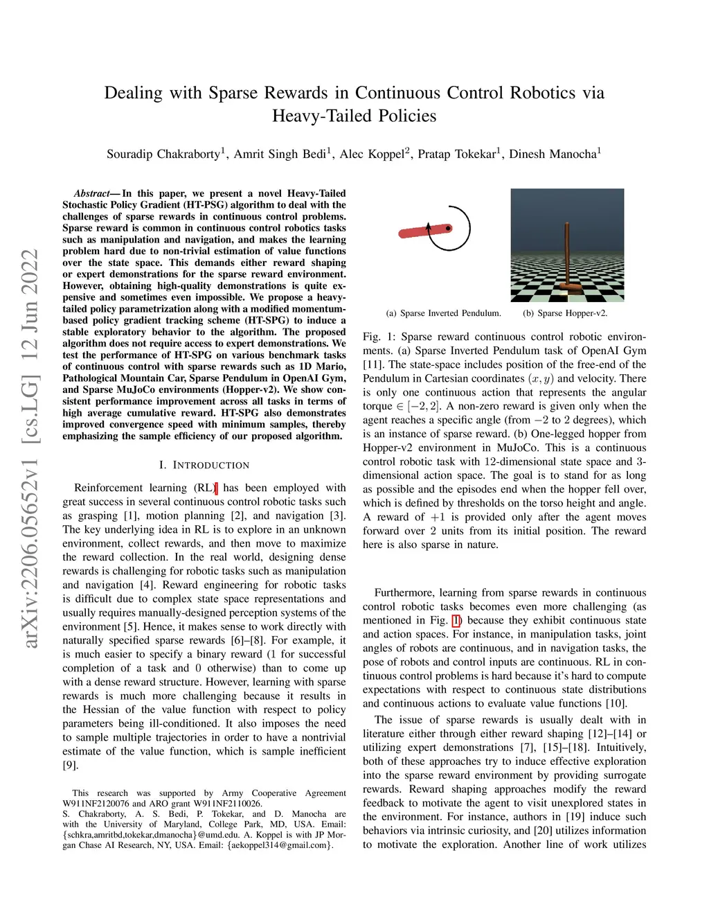 In this paper, we present a novel Heavy-Tailed Stochastic Policy Gradient (HT-PSG) algorithm to deal with the challenges of sparse rewards in continuous control problems. Sparse reward is common in continuous control robotics tasks such as manipulation and navigation, and makes the learning problem hard due to non-trivial estimation of value functions over the state space. This demands either reward shaping or expert demonstrations for the sparse reward environment. However, obtaining high-quality demonstrations is quite expensive and sometimes even impossible. We propose a heavy-tailed policy parametrization along with a modified momentum-based policy gradient tracking scheme (HT-SPG) to induce a stable exploratory behavior to the algorithm. The proposed algorithm does not require access to expert demonstrations. We test the performance of HT-SPG on various benchmark tasks of continuous control with sparse rewards such as 1D Mario, Pathological Mountain Car, Sparse Pendulum in OpenAI Gym, and Sparse MuJoCo environments (Hopper-v2). We show consistent performance improvement across all tasks in terms of high average cumulative reward. HT-SPG also demonstrates improved convergence speed with minimum samples, thereby emphasizing the sample efficiency of our proposed algorithm.