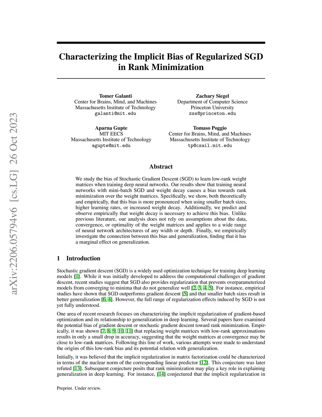 We study the bias of Stochastic Gradient Descent (SGD) to learn low-rank weight matrices when training deep neural networks. Our results show that training neural networks with mini-batch SGD and weight decay causes a bias towards rank minimization over the weight matrices. Specifically, we show, both theoretically and empirically, that this bias is more pronounced when using smaller batch sizes, higher learning rates, or increased weight decay. Additionally, we predict and observe empirically that weight decay is necessary to achieve this bias. Unlike previous literature, our analysis does not rely on assumptions about the data, convergence, or optimality of the weight matrices and applies to a wide range of neural network architectures of any width or depth. Finally, we empirically investigate the connection between this bias and generalization, finding that it has a marginal effect on generalization.