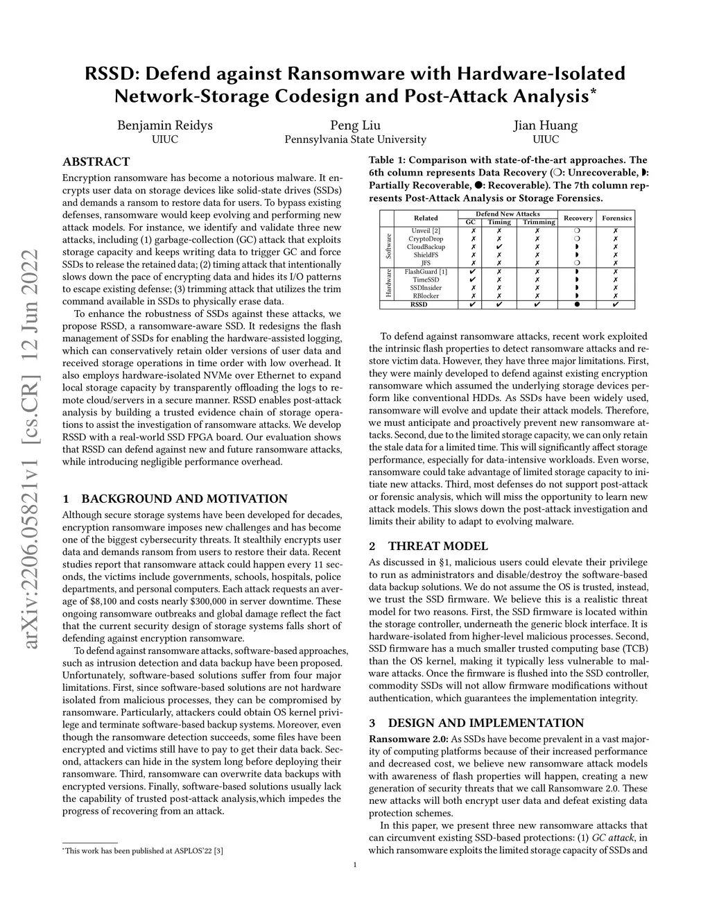 Encryption ransomware has become a notorious malware. It encrypts user data on storage devices like solid-state drives (SSDs) and demands a ransom to restore data for users. To bypass existing defenses, ransomware would keep evolving and performing new attack models. For instance, we identify and validate three new attacks, including (1) garbage-collection (GC) attack that exploits storage capacity and keeps writing data to trigger GC and force SSDs to release the retained data; (2) timing attack that intentionally slows down the pace of encrypting data and hides its I/O patterns to escape existing defense; (3) trimming attack that utilizes the trim command available in SSDs to physically erase data. To enhance the robustness of SSDs against these attacks, we propose RSSD, a ransomware-aware SSD. It redesigns the flash management of SSDs for enabling the hardware-assisted logging, which can conservatively retain older versions of user data and received storage operations in time order with low overhead. It also employs hardware-isolated NVMe over Ethernet to expand local storage capacity by transparently offloading the logs to remote cloud/servers in a secure manner. RSSD enables post-attack analysis by building a trusted evidence chain of storage operations to assist the investigation of ransomware attacks. We develop RSSD with a real-world SSD FPGA board. Our evaluation shows that RSSD can defend against new and future ransomware attacks, while introducing negligible performance overhead.
