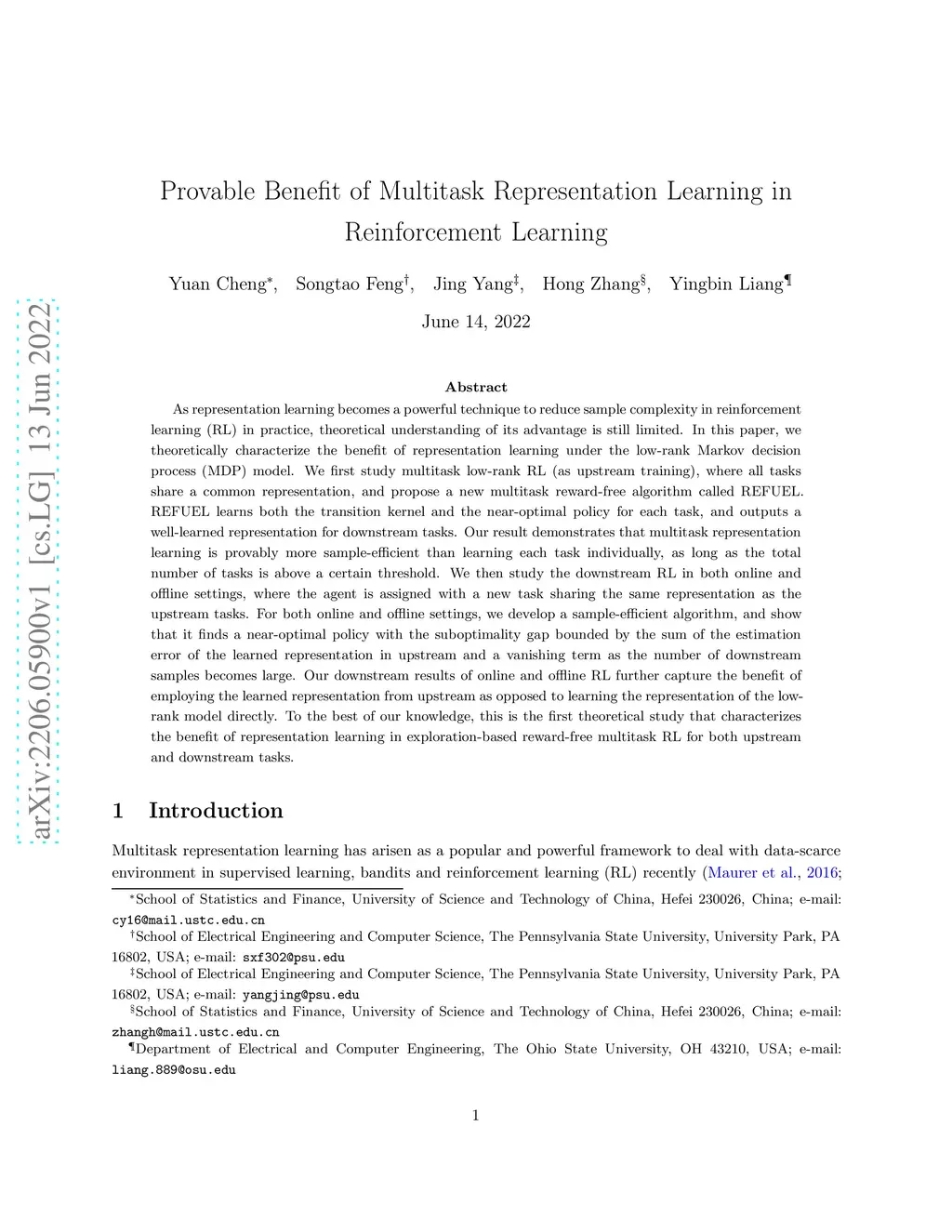 As representation learning becomes a powerful technique to reduce sample complexity in reinforcement learning (RL) in practice, theoretical understanding of its advantage is still limited. In this paper, we theoretically characterize the benefit of representation learning under the low-rank Markov decision process (MDP) model. We first study multitask low-rank RL (as upstream training), where all tasks share a common representation, and propose a new multitask reward-free algorithm called REFUEL. REFUEL learns both the transition kernel and the near-optimal policy for each task, and outputs a well-learned representation for downstream tasks. Our result demonstrates that multitask representation learning is provably more sample-efficient than learning each task individually, as long as the total number of tasks is above a certain threshold. We then study the downstream RL in both online and offline settings, where the agent is assigned with a new task sharing the same representation as the upstream tasks. For both online and offline settings, we develop a sample-efficient algorithm, and show that it finds a near-optimal policy with the suboptimality gap bounded by the sum of the estimation error of the learned representation in upstream and a vanishing term as the number of downstream samples becomes large. Our downstream results of online and offline RL further capture the benefit of employing the learned representation from upstream as opposed to learning the representation of the low-rank model directly. To the best of our knowledge, this is the first theoretical study that characterizes the benefit of representation learning in exploration-based reward-free multitask RL for both upstream and downstream tasks.