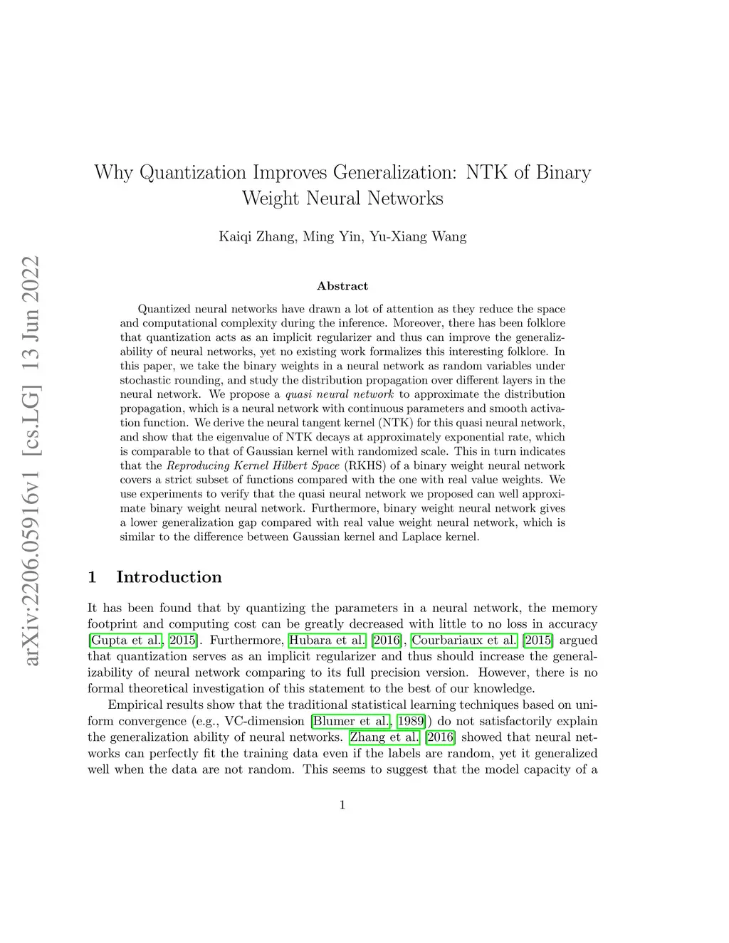 Quantized neural networks have drawn a lot of attention as they reduce the space and computational complexity during the inference. Moreover, there has been folklore that quantization acts as an implicit regularizer and thus can improve the generalizability of neural networks, yet no existing work formalizes this interesting folklore. In this paper, we take the binary weights in a neural network as random variables under stochastic rounding, and study the distribution propagation over different layers in the neural network. We propose a quasi neural network to approximate the distribution propagation, which is a neural network with continuous parameters and smooth activation function. We derive the neural tangent kernel (NTK) for this quasi neural network, and show that the eigenvalue of NTK decays at approximately exponential rate, which is comparable to that of Gaussian kernel with randomized scale. This in turn indicates that the Reproducing Kernel Hilbert Space (RKHS) of a binary weight neural network covers a strict subset of functions compared with the one with real value weights. We use experiments to verify that the quasi neural network we proposed can well approximate binary weight neural network. Furthermore, binary weight neural network gives a lower generalization gap compared with real value weight neural network, which is similar to the difference between Gaussian kernel and Laplace kernel.