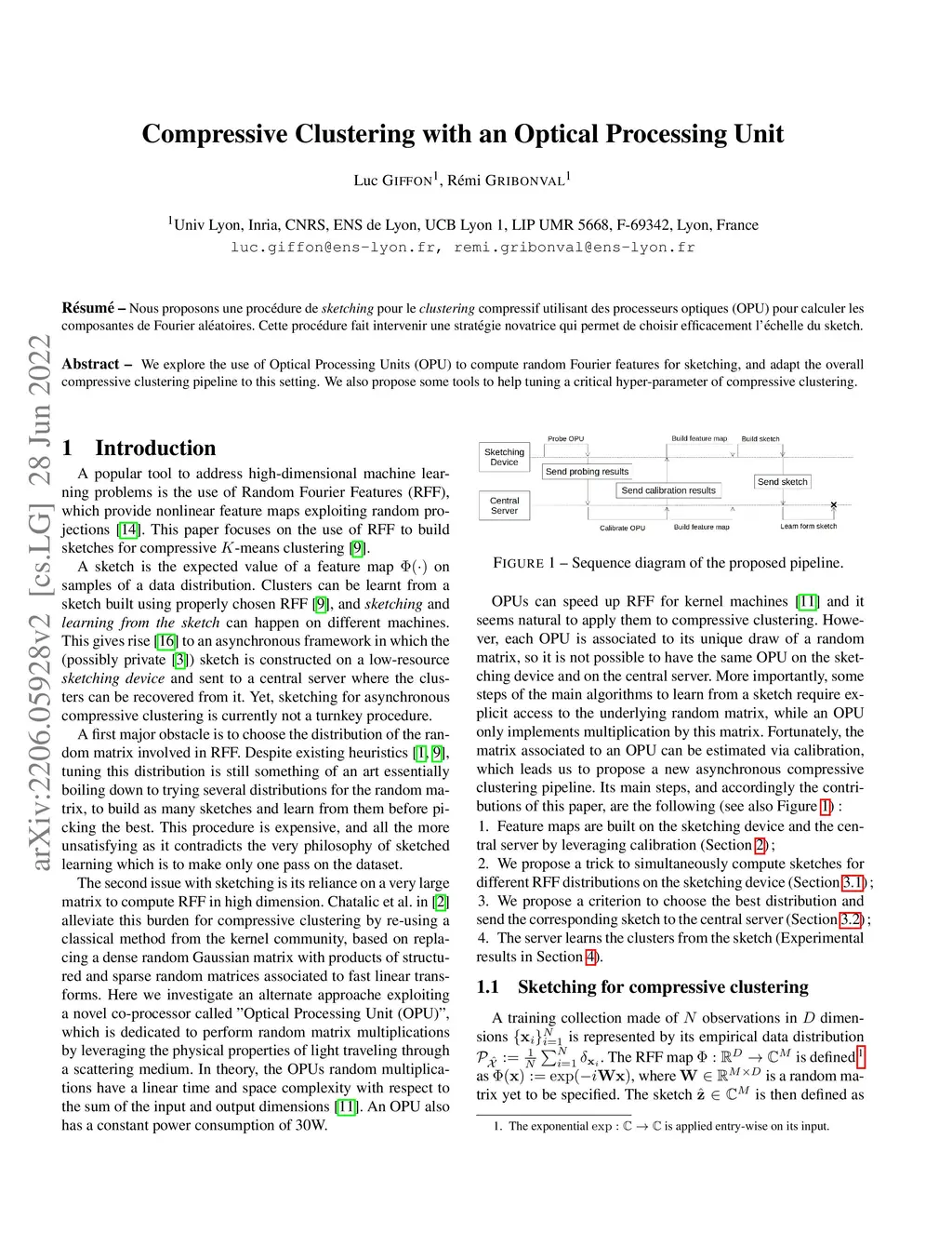 We explore the use of Optical Processing Units (OPU) to compute random Fourier features for sketching, and adapt the overall compressive clustering pipeline to this setting. We also propose some tools to help tuning a critical hyper-parameter of compressive clustering.