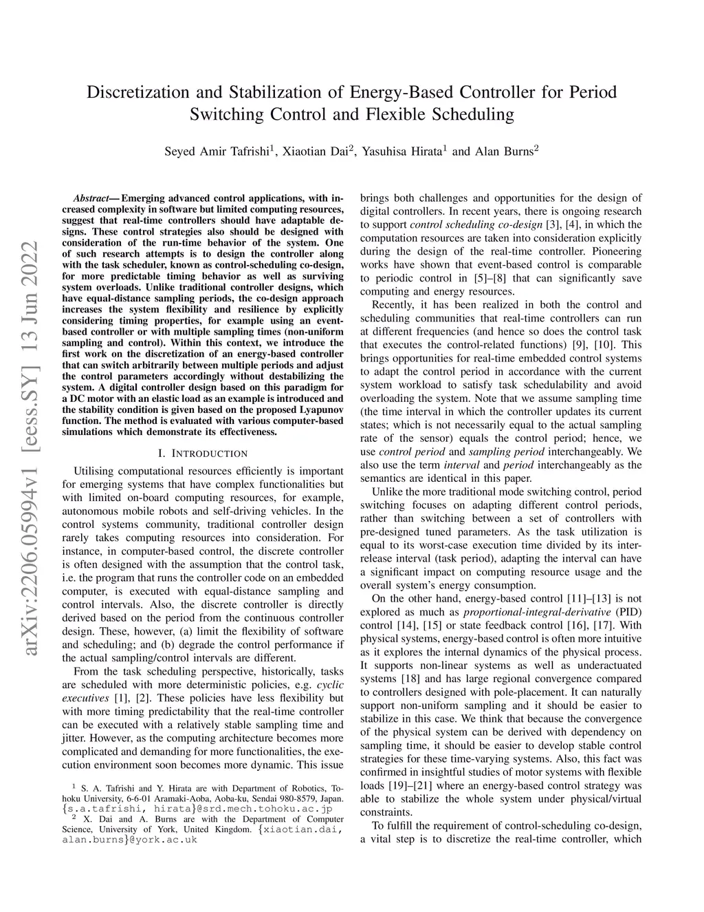 Emerging advanced control applications, with increased complexity in software but limited computing resources, suggest that real-time controllers should have adaptable designs. These control strategies also should be designed with consideration of the run-time behavior of the system. One of such research attempts is to design the controller along with the task scheduler, known as control-scheduling co-design, for more predictable timing behavior as well as surviving system overloads. Unlike traditional controller designs, which have equal-distance sampling periods, the co-design approach increases the system flexibility and resilience by explicitly considering timing properties, for example using an event-based controller or with multiple sampling times (non-uniform sampling and control). Within this context, we introduce the first work on the discretization of an energy-based controller that can switch arbitrarily between multiple periods and adjust the control parameters accordingly without destabilizing the system. A digital controller design based on this paradigm for a DC motor with an elastic load as an example is introduced and the stability condition is given based on the proposed Lyapunov function. The method is evaluated with various computer-based simulations which demonstrate its effectiveness.